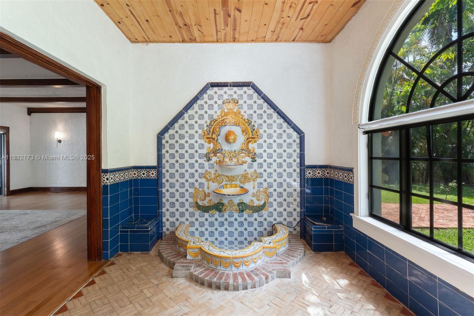 Experience timeless elegance in this stunning Coral Gables Mediterranean Villa, featuring exquisite Moroccan details on a coveted corner 1/2 acre lot. A charming courtyard entry leads to sunroom w/ arched windows & tranquil fountain. The grand living room boasts soaring beamed ceilings, carved fireplace & adjoining formal dining room. Beautifully crafted wood-scroll staircase ascends to the master suite, complete w/ fireplace, rich wood floors & private terrace overlooking the sparkling pool & serene fountain. The enchanting carriage house/guest cottage have impact windows & doors. Lush landscaping, peaceful pond & charming gazebo complete this architectural masterpiece, originally designed by renowned architect Martin Luther Hampton. Walk to Granada Golf Course, tennis & restaurants.