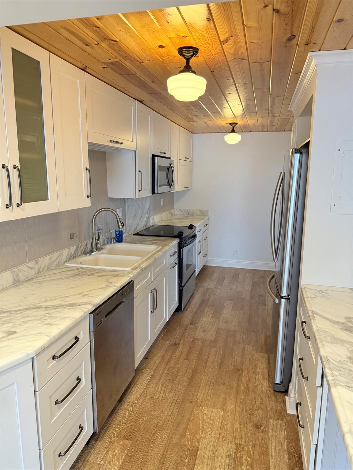 Beautifully updated 2nd floor corner unit with 2 ensuite bed/ baths, freshly painted in soothing gray and white hues. Walk in and see the water from your front door! A modern kitchen awaits with marble counters, white cabinets and SS appliances. All closets have been outfitted with new shelving. Primary suite has new carpeting. Bath has private water closet and marble flooring. Amenities: 24hr manned gate, 5 heated pools, lighted tennis & pickleball, EV charging. Additional storage on site inc. Rent includes water/sewer, cable w/HBO & hot water. Fantastic location, minutes to beaches, parks, and Mizner Parks fabulous shopping and dining