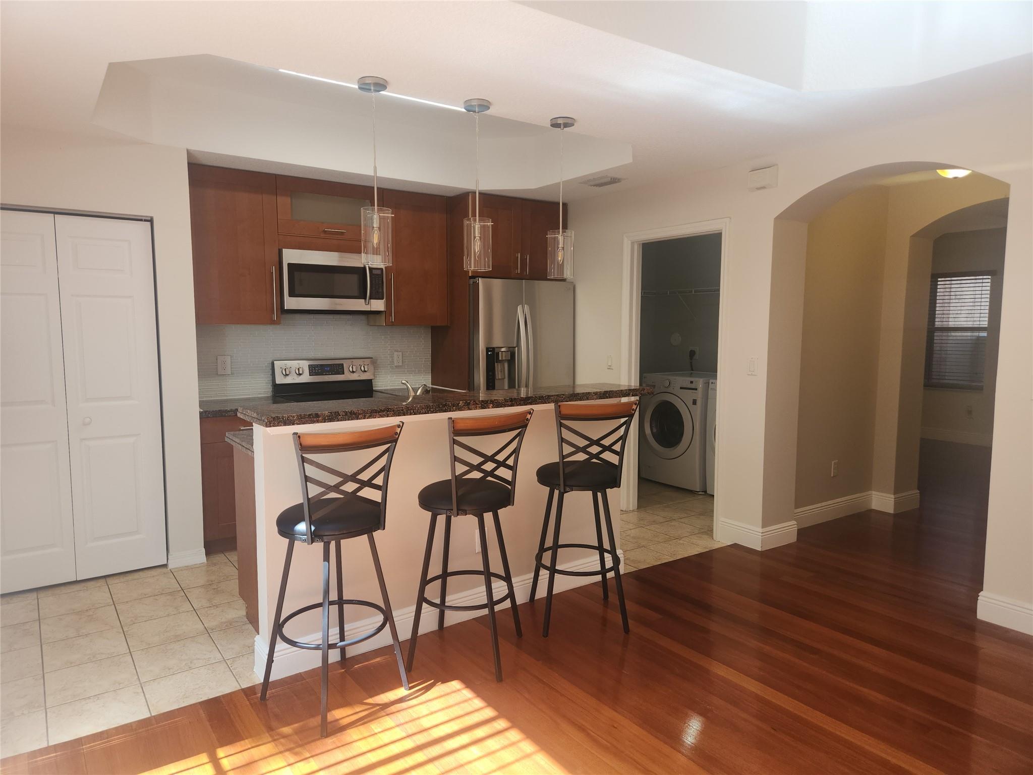Charming well maintained 3/2.5 Mediterranean style townhouse is one of the largest models here. Features updated kitchen,2yr old SS appliances, new fridge,full size washer & dryer,eat-in kitchen/family room with separate living/dining area. New A/C unit and front & back patio. 2nd level-3 spacious bedrooms,walk-in closet & plenty of storage with new flooring. This 24 hr. gated community offers resort style pool/hot tub & kid park. Perfectly located to access main highways,airport/train/buses,Outdoor World,Dania Pointe/shopping/restaurants & close to Hard Rock Hotel. Excellent & convenient location!
