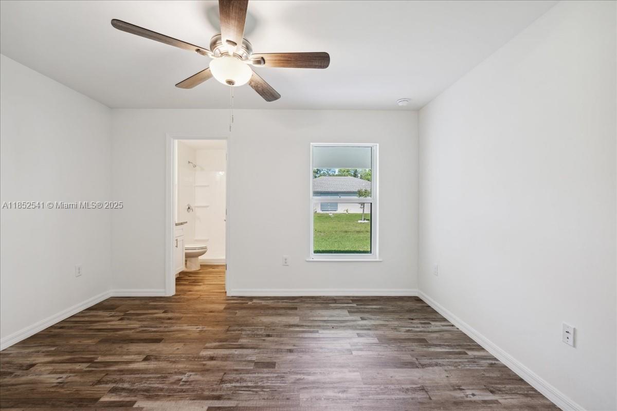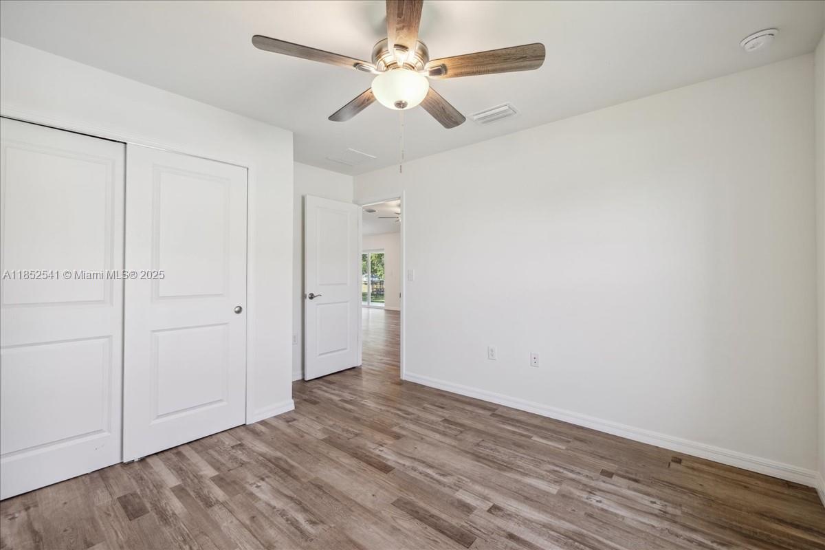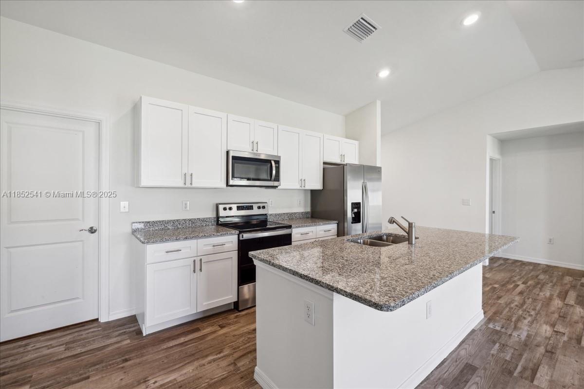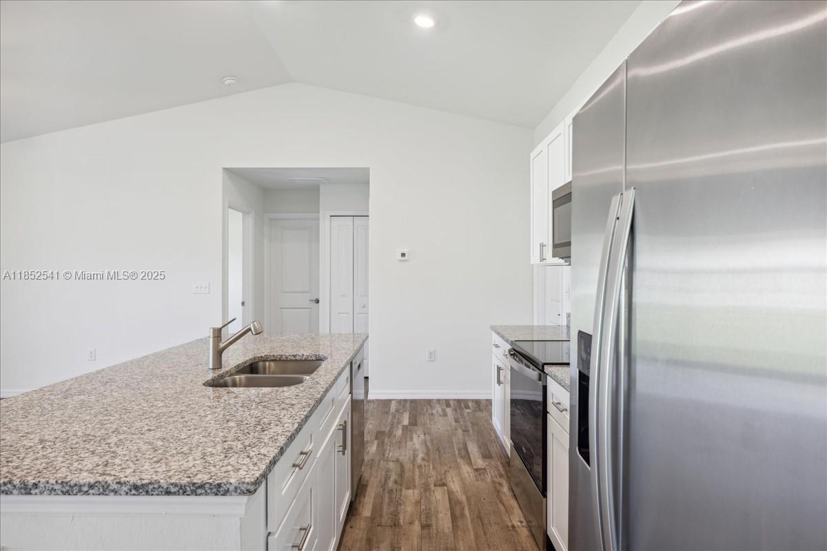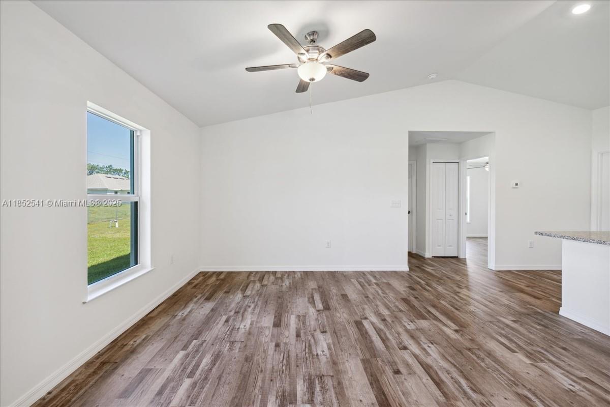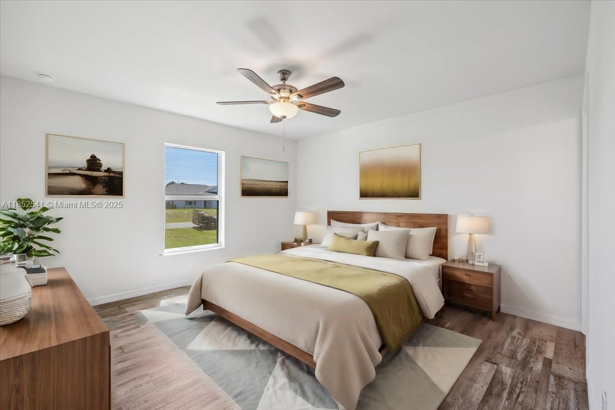 Move-in ready!!! This stunning property features 4 bedrooms and 3 full bathrooms, boasting not one but two master suites! The expansive layout with a vaulted ceiling offers an ideal setting for entertaining. Enjoy the elegance of high-end shaker cabinets in the kitchen, complemented by plank flooring throughout. Stainless steel appliances add a touch of sophistication. Step out to a generous covered lanai overlooking the spacious backyard. Plus, benefit from a full irrigation system and the convenience of impact doors and windows, eliminating the need for shutters.