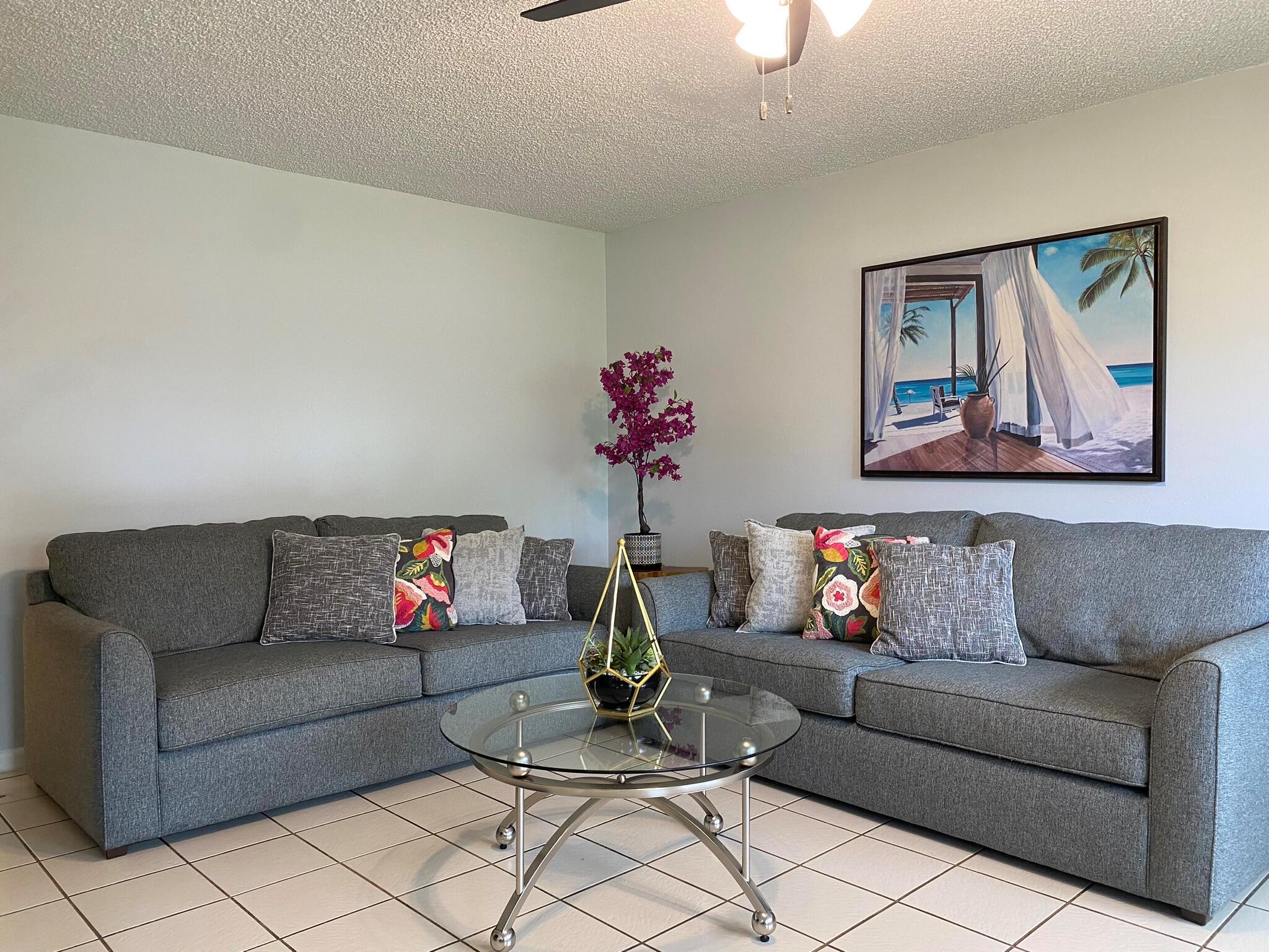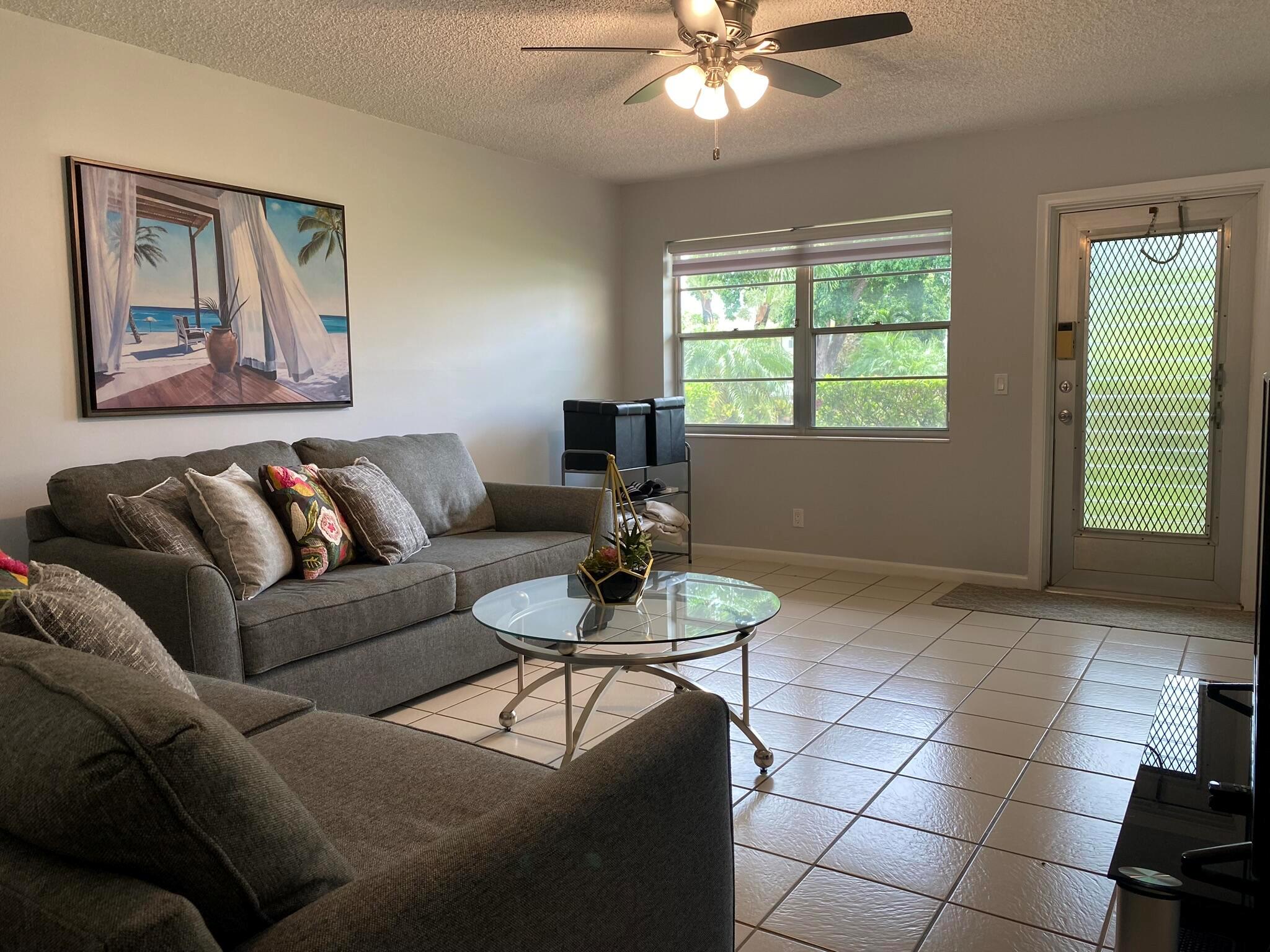 Discover your dream home in this recently remodeled 2-bedroom, 1.5-bath condo in the heart of Century Village, West Palm Beach--a vibrant 55+ community where luxury meets lifestyle! This first-floor gem boasts modern upgrades, including a contemporary kitchen with newer appliances, fully updated bathrooms with a step-in shower, and gleaming ceramic flooring throughout. Stay cool with central AC and unwind on your enclosed private patio, opening to a serene backyard garden with lush grassy views and mature trees--perfect for morning coffee or evening relaxation.Located in the prestigious Windsor N section, this condo offers unmatched comfort and convenience. Step into a bright, open layout designed for easy living, with every detail thoughtfully updated. Beyond your door, Century Village's