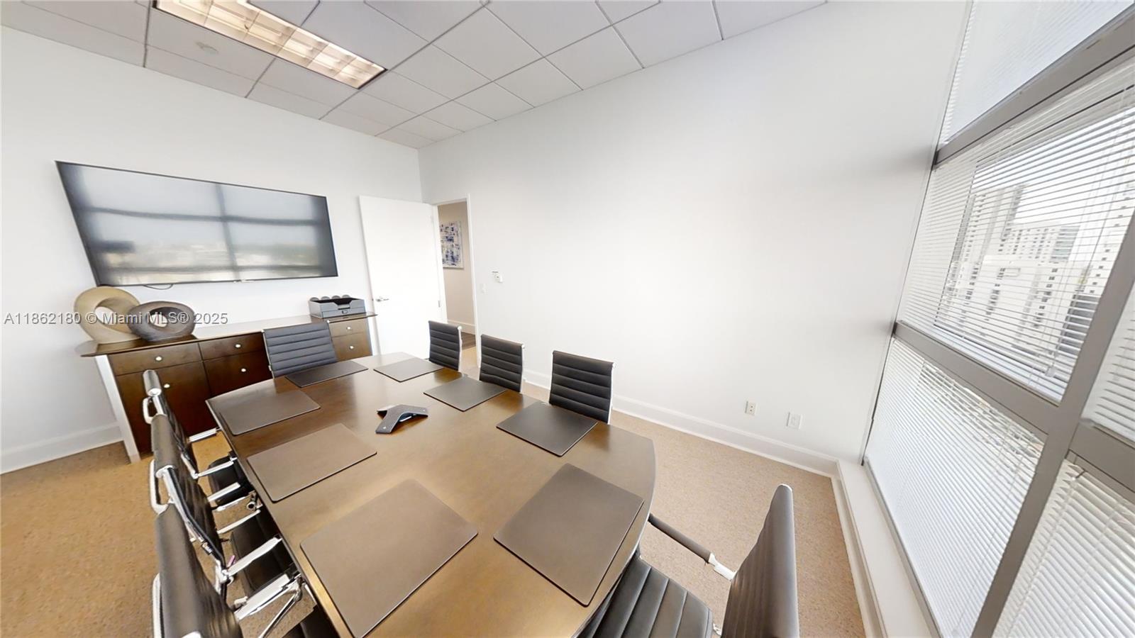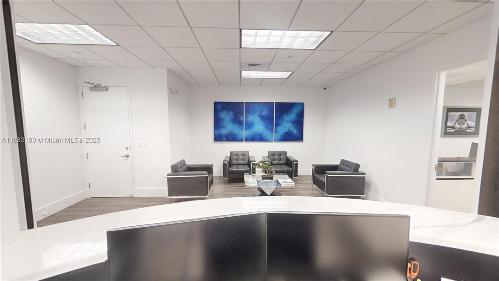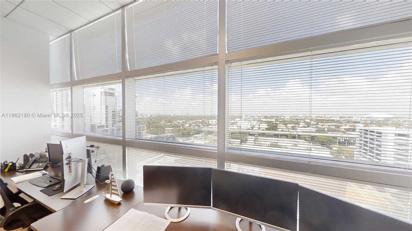 Corner Office Fully furnished 1472 sq ft SHARED SPACE of 2124 sq ft. with only two owner members. Up to 3 separate workstation areas included. One 25' x 12'-foot office area desk, One 20' x 19' Five-person workstation, One 8' x 10' reception desk. Plus, private lobby waiting room receptionist area, large conference room & storage/IT room & filing cabinets a rarely available private kitchen/lunch area. Perfect for professional financial services style office. Excellent location on the Miami Riverwalk path and on-site restaurants for visiting clientele. Guest parking and valet available for monthly rates.