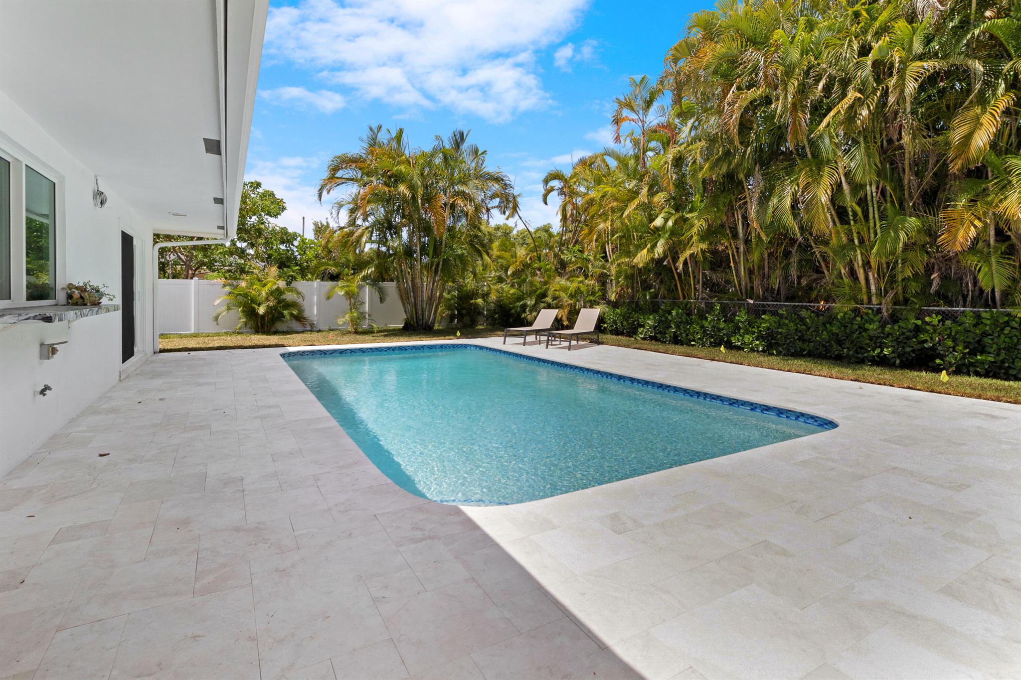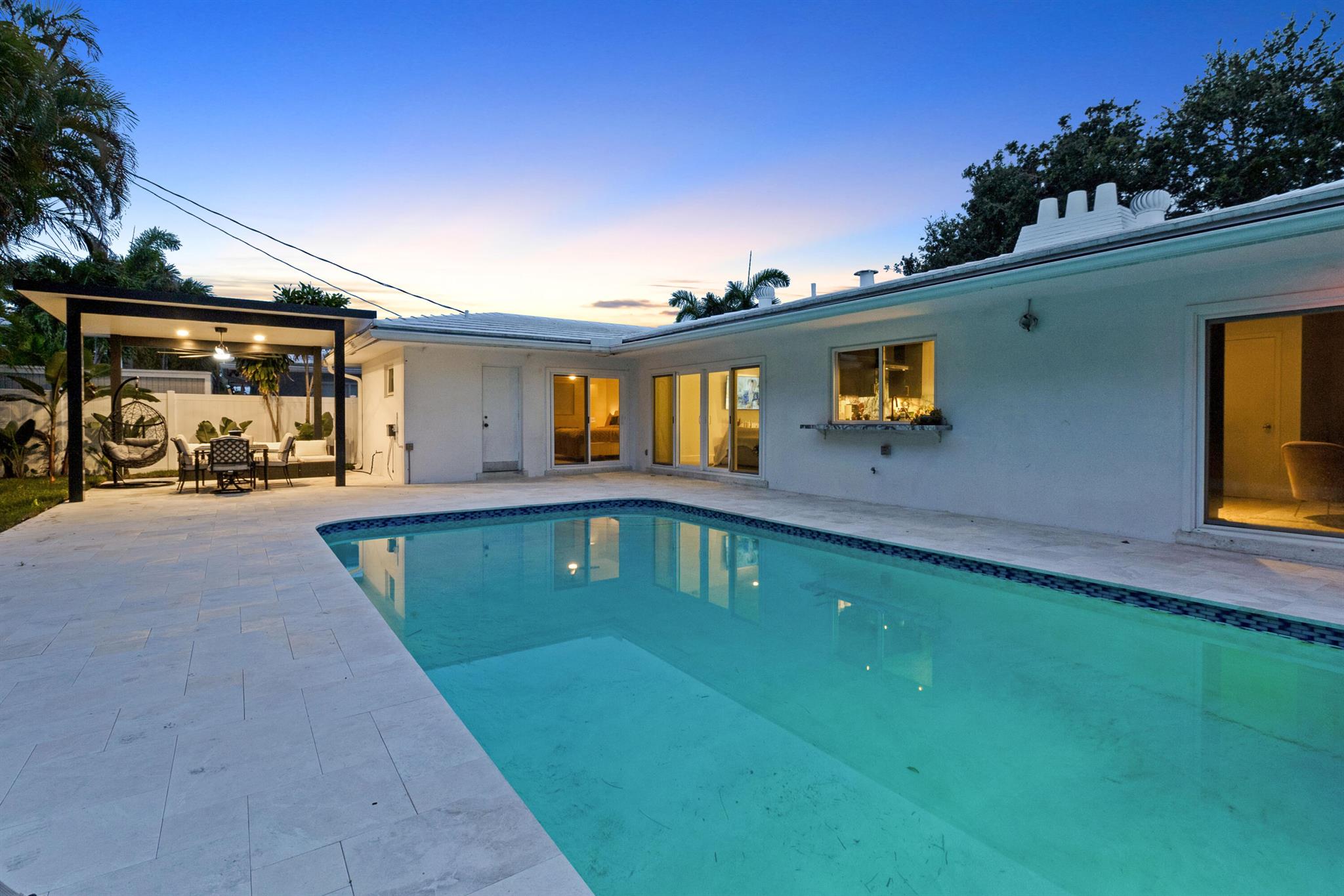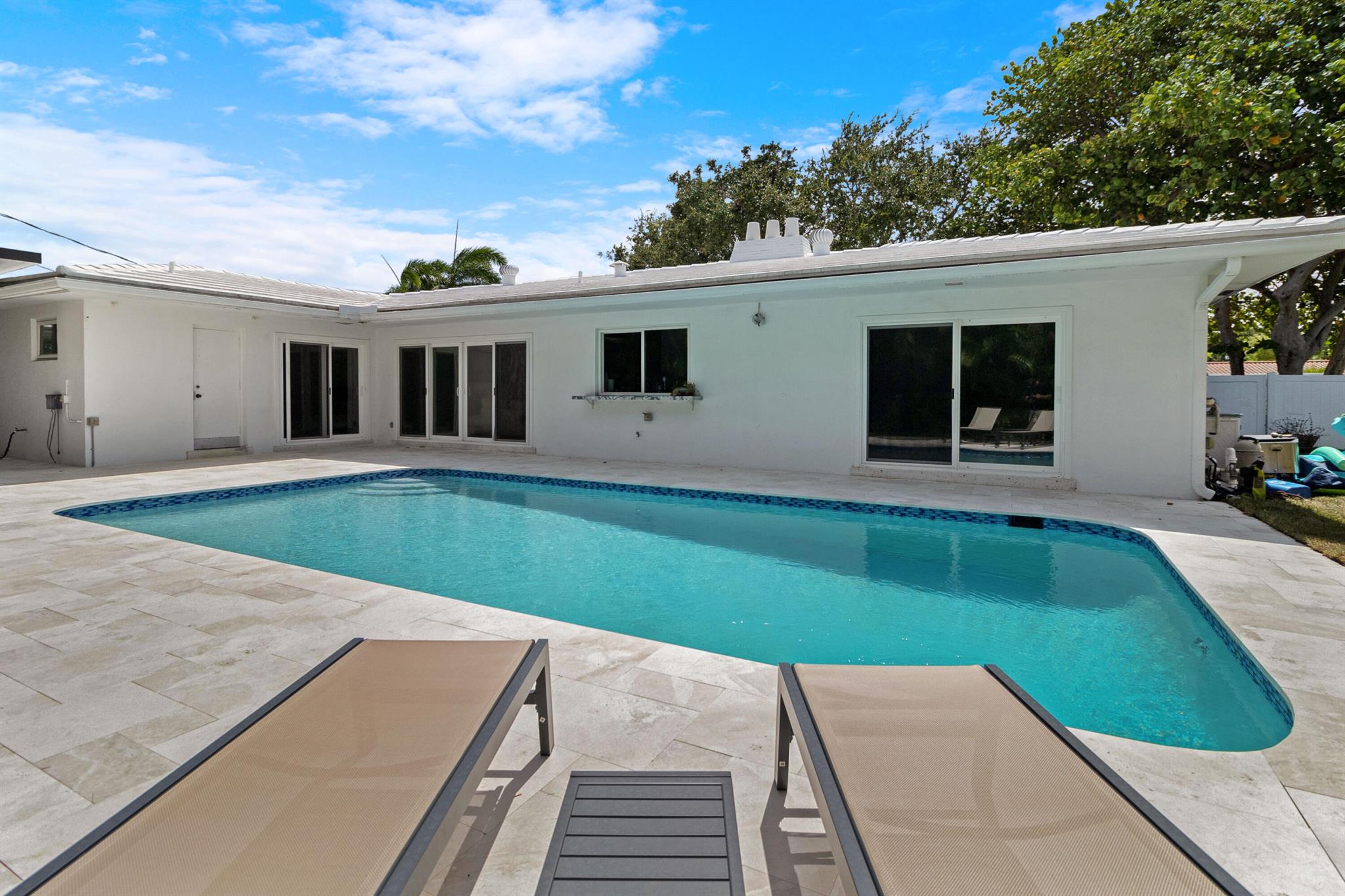 Welcome to this beautifully renovated 3/2, pool home in the highly sought-after Imperial Point neighborhood. Nestled on a lushly landscaped corner lot, this property boasts incredible curb appeal with a decorative circular driveway, courtyard entry, & full 2 car garage with epoxy flooring and air conditioning. Featuring Evie Haya premium porcelain tile flooring throughout and freshly painted interiors, this home blends modern comfort with designer finishes. The stunning primary bathroom showcases luxury porcelain tile, a frameless glass shower, a modern vanity, Delta TempAssure shower system, and bronze fixtures from Ferguson. Upgrades include complete impact glass and doors, a new RHEEM 80-gallon electric water heater, trenchless pipelined sewer system, smart thermostat,