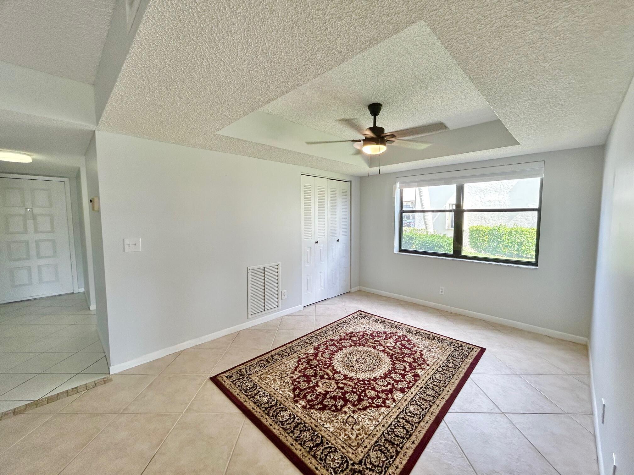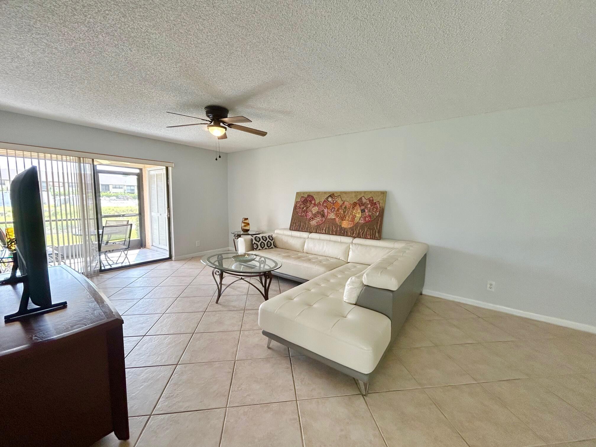 2 bedroom 2 bath 1st floor corner condo. Parking right up front. Large eat in kitchen with pass through to dining room. 3rd room with closet can be used as office/den. Master bedroom features a walk in closet and ensuite bathroom with walk in shower. enclosed back porch with water view and laundry closet. Community offers large clubhouse, lobby, theater with entertainment, billiards, bocce and shuffleboard, library, tennis, 2 heated swimming pools, hot tub, whirlpool and sauna. Bus service from the clubhouse to shopping, medical and excursions. Lake Worth Beach 10 miles away. Close to turnpike, shopping and medical.