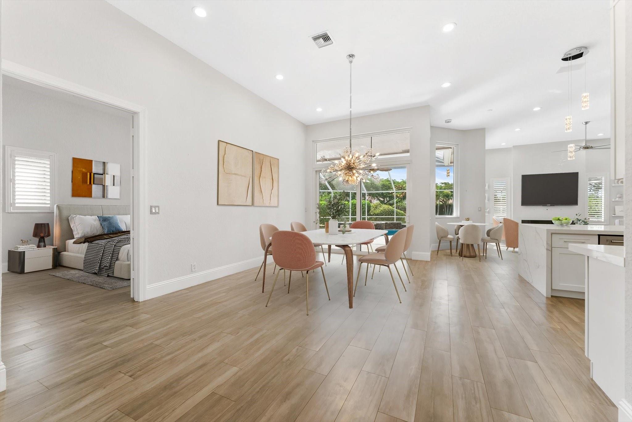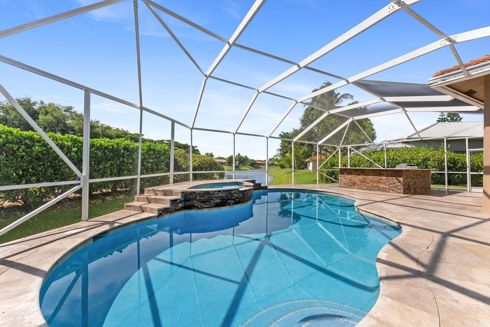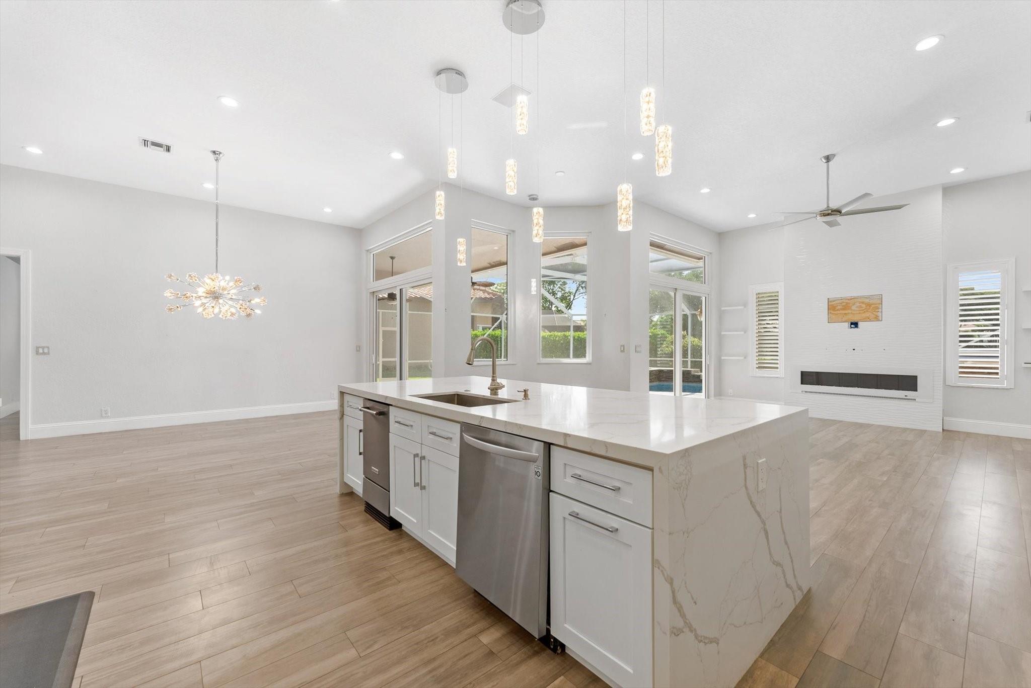 Completely reimagined & impeccably renovated with the finest materials. A sophisticated, contemporary oasis tailored for Florida’s seamless indoor/outdoor lifestyle. Walls of impact windows & doors flood the space with natural light & offer stunning views of the pool & lake. At the heart of the home, a show-stopping white kitchen takes center stage, featuring a dramatic waterfall island, quartz counters, top-of-the-line appliances & a striking glass tile backsplash. The Primary suite is impressive in size & boasts a spa like bathroom, several large closets with cabinetry & serene water views. Outside is an expansive screened porch with a heated saltwater pool with a spa & full service summer kitchen. Other offerings: Wood Like tile thruout, gorgeous lighting, Tesla charging station & more.