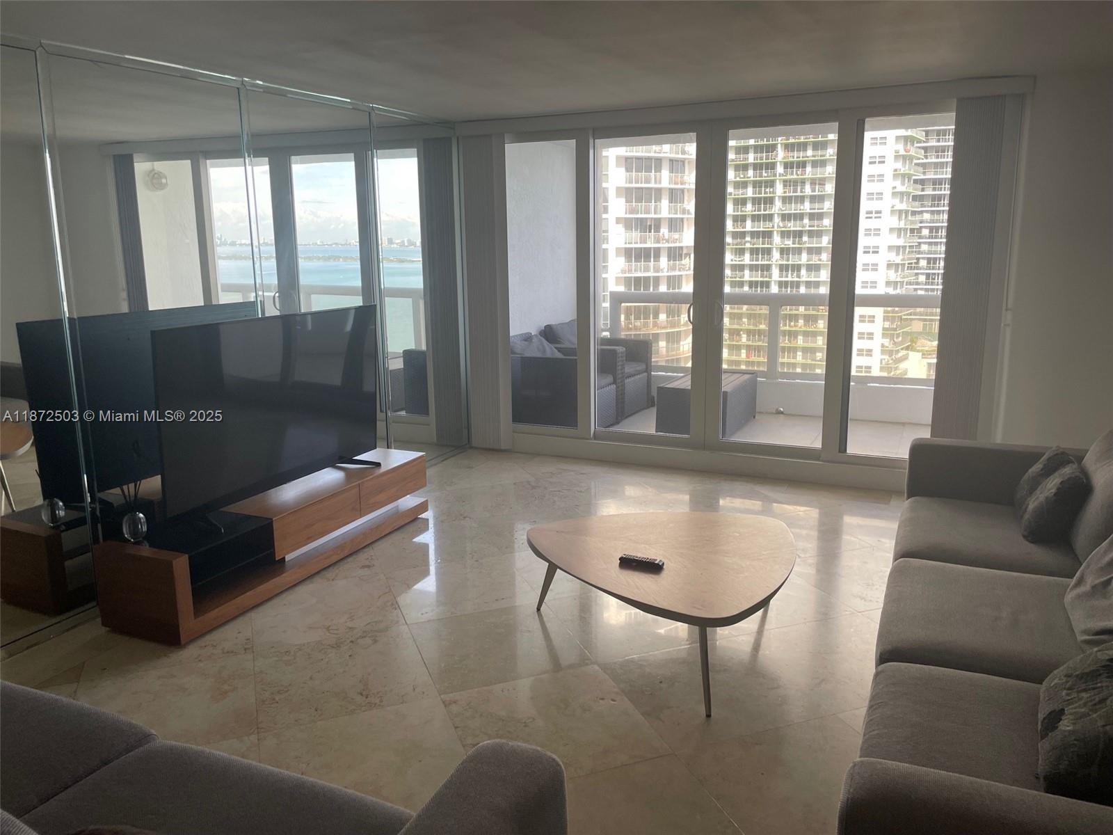 Fully furnished spacious 3 BR/2 BTH with balcony and great open views of Biscayne Bay and Margaret Pace Park available for seasonal rental. The unit has two full bedrooms and a large den as a third bedroom and two full baths. Can accommodate up to four adults and two children. The Grand is a full service building with restaurants, market, stores, beauty salon, health club, 24 hours concierge, outdoor pool and Jacuzzi, marina on site. Walking distance to the art center, art and science museums. Unit faces North East. NO PETS please.