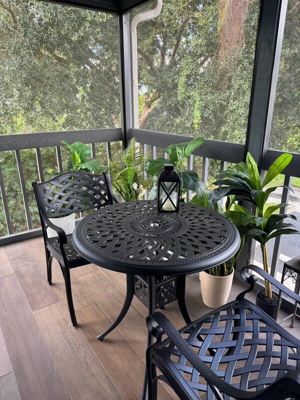 Welcome to this charming 2-bedroom, 2-bath condo, ideally located on the second floor in Hobe Sound, perfectly nestled between the vibrant cities of Jupiter and Stuart. The entrance features a screened balcony, offering a private space for fresh air and relaxation, complete with a convenient locked storage area. Inside, the home is painted in neutral colors, creating a bright and inviting atmosphere. The open-concept living and dining area provides a seamless flow, leading to a functional kitchen with classic cabinets, white appliances, and a snack bar for casual dining. A pantry and a stacked in-unit washer and dryer add to the home's effortless convenience.