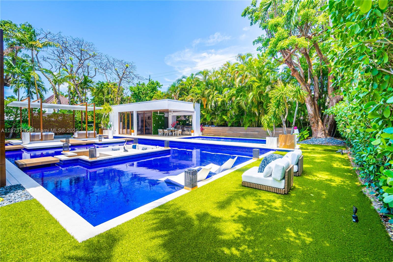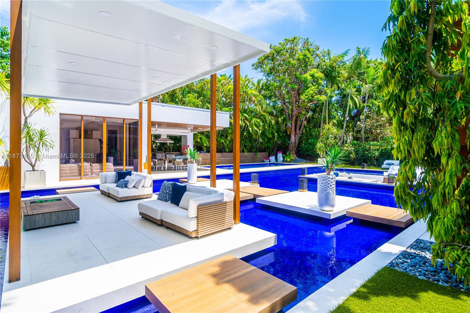 Exquisite modern residence is a stunning expression of contemporary luxury in one of Miami Beach's most exclusive neighborhoods. Spanning 5,119 SF + 14,300 SF lot, home features 4 beds/4.5 baths & open, light-filled design w/ bespoke detail throughout. Great room is framed by floor-to-ceiling glass, seamlessly connecting to lush landscaping by Lewis Aqui. Marble & quartz flooring on the 1st level transition to warm oak upstairs, complemented by elegant Delta lighting. Snaidero kitchen w/ Miele appliances, double ovens + sleek cabinetry. Spaces include office, den, pool house + gym. Outdoors, shimmering pool, summer kitchen & dining areas provide the perfect setting for entertaining. The home's refined aesthetic is enhanced by Prodema cladding, while a full-house generator adds convenience.