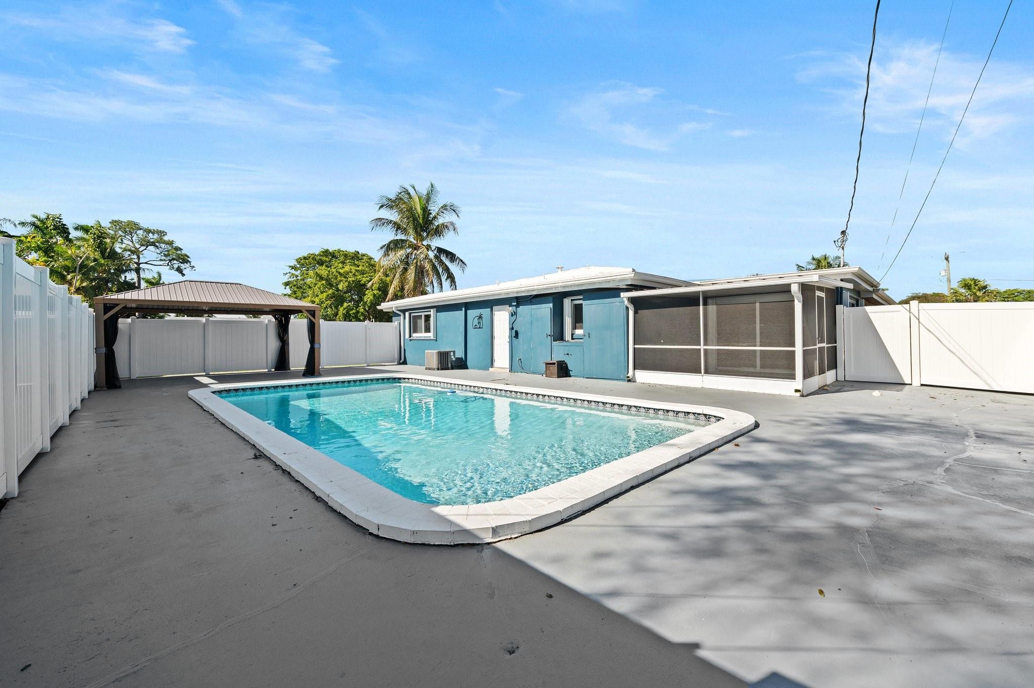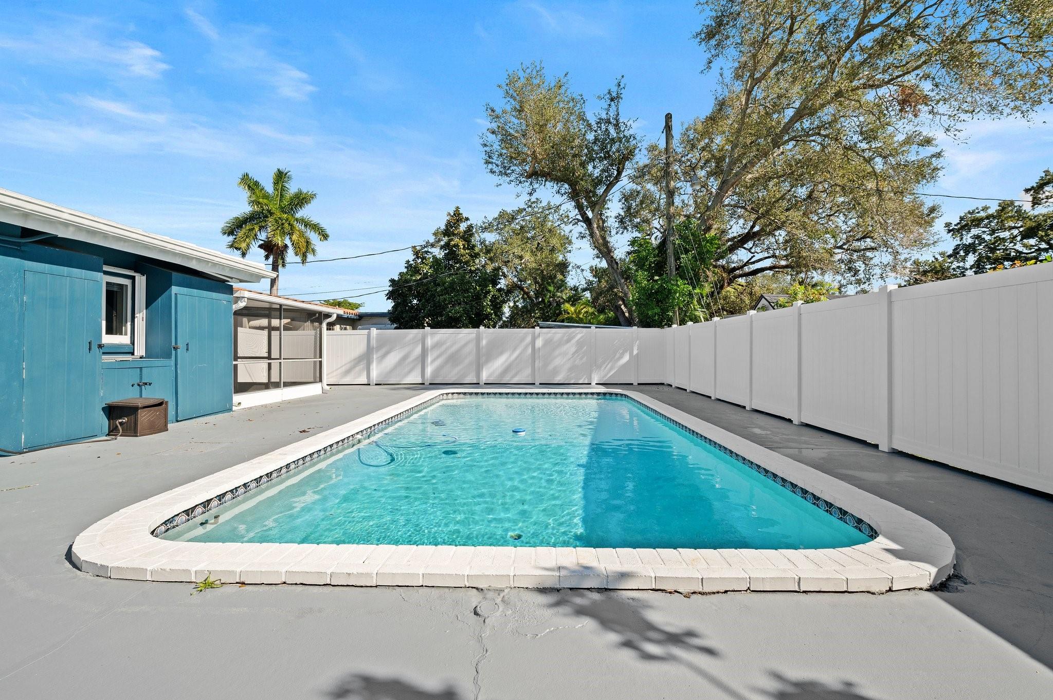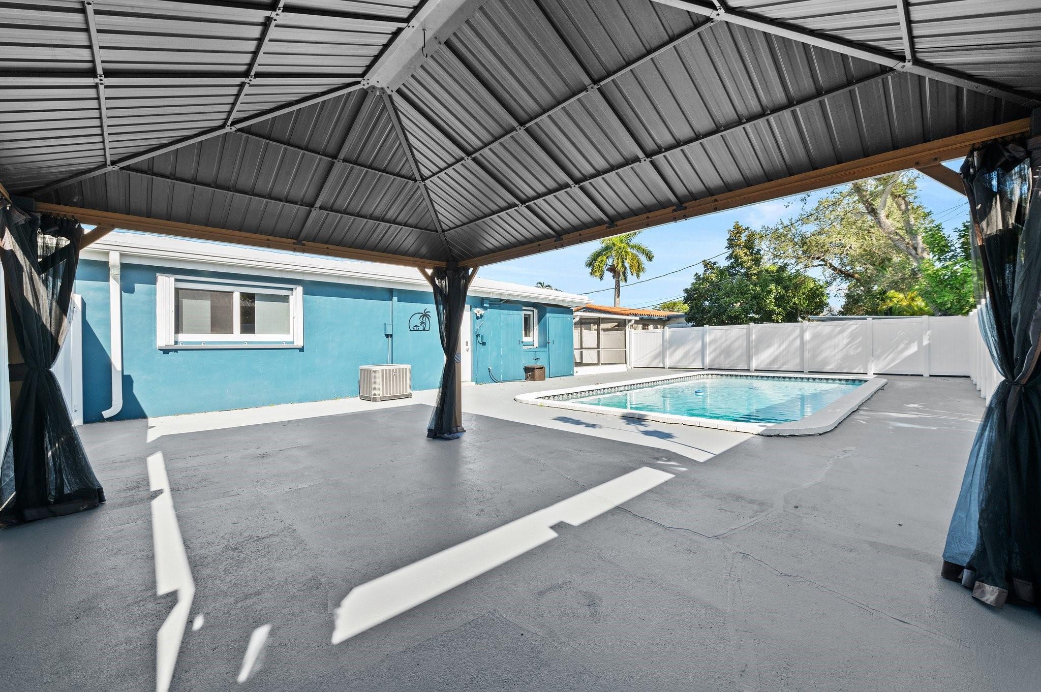Welcome to your dream home! This beautifully maintained mid-century modern gem blends timeless style with today’s conveniences. Fully move-in-ready, it features a lifetime roof with transferable warranty, new A/C and ductwork, impact windows with hurricane shutters, new pool pump, water heater, ceiling fans, window treatments, and toilets in both bathrooms. The renovated carport adds charm and function. The primary suite opens directly to a private backyard oasis with an inviting in-ground pool, perfect for relaxing or entertaining under the Florida sun.