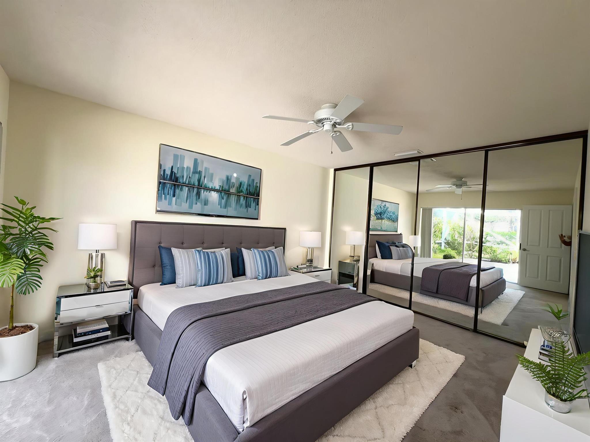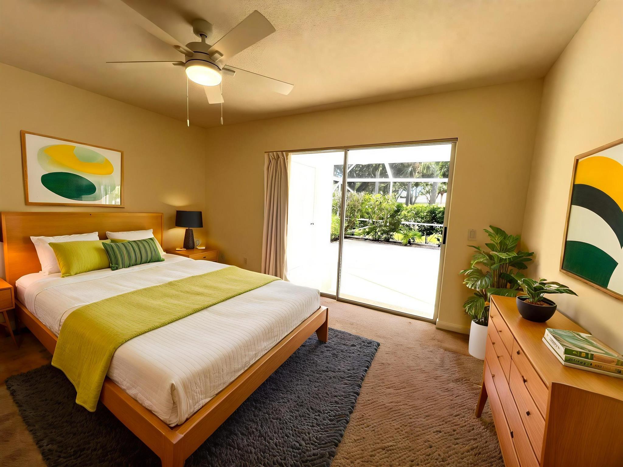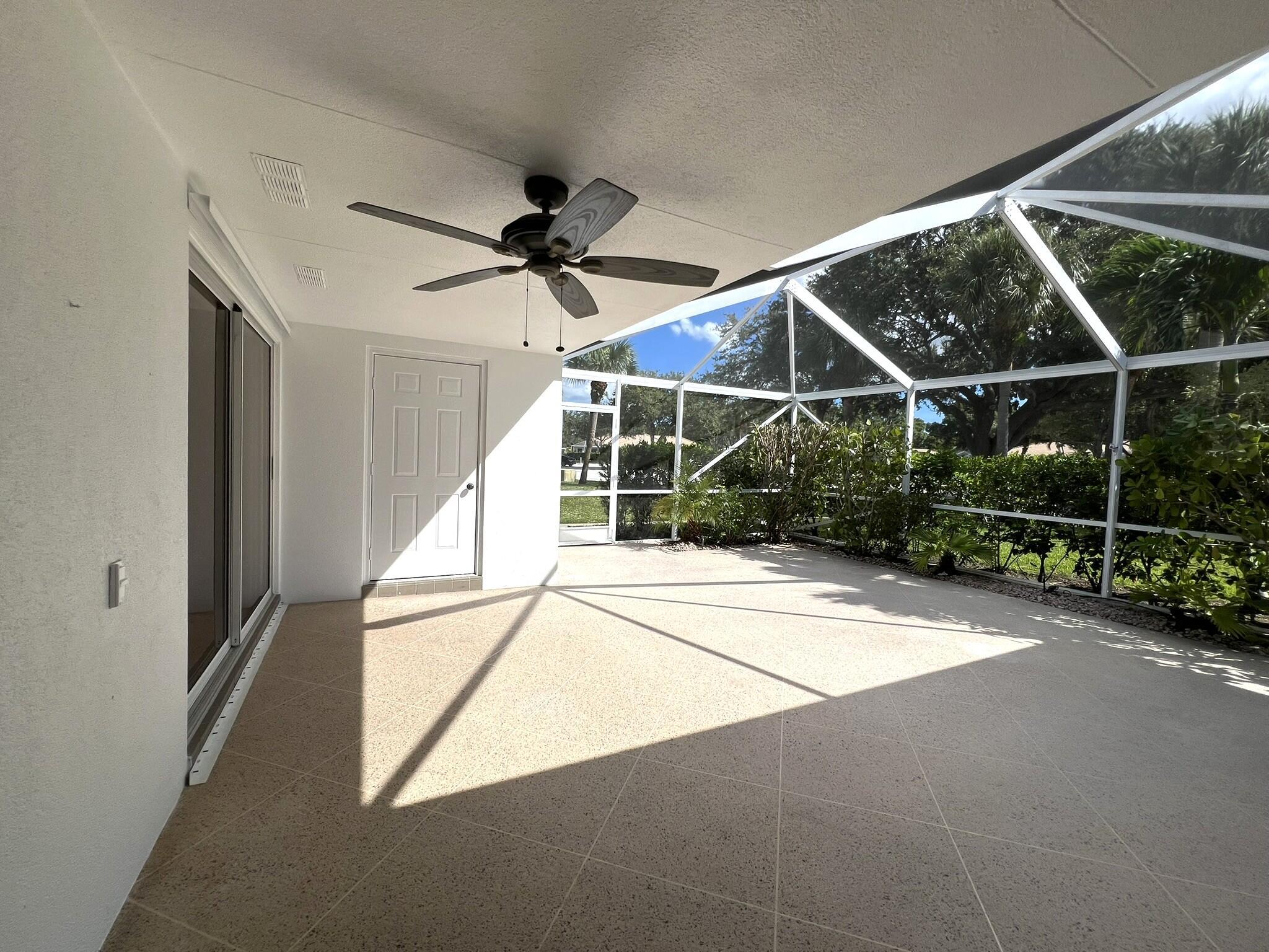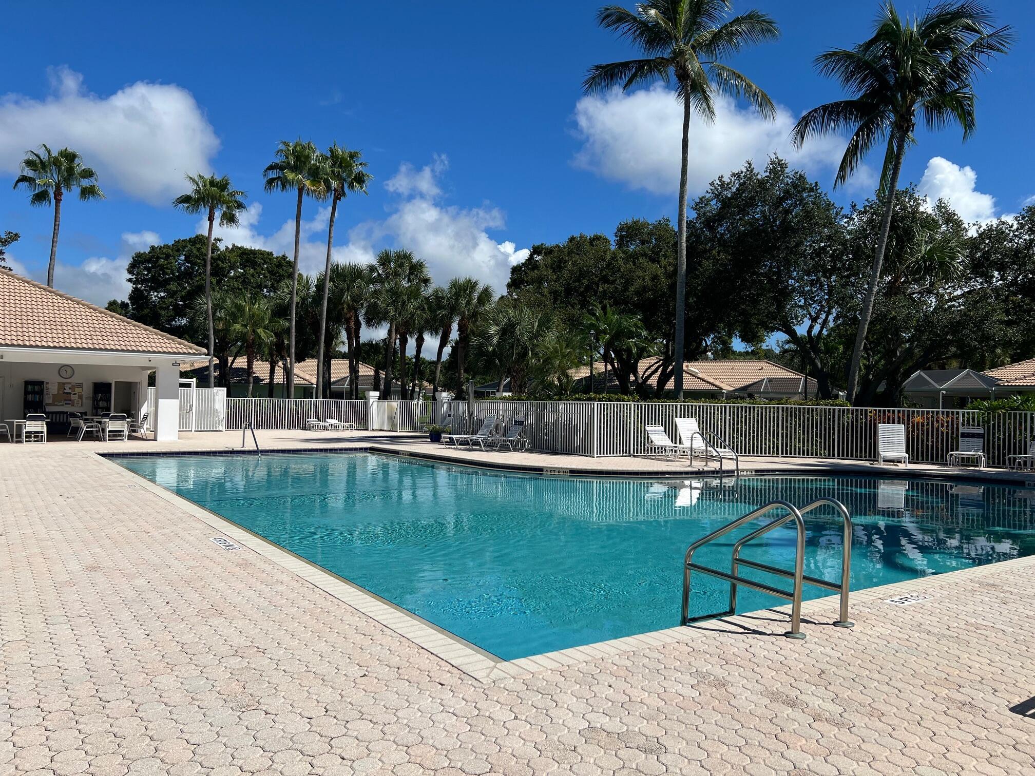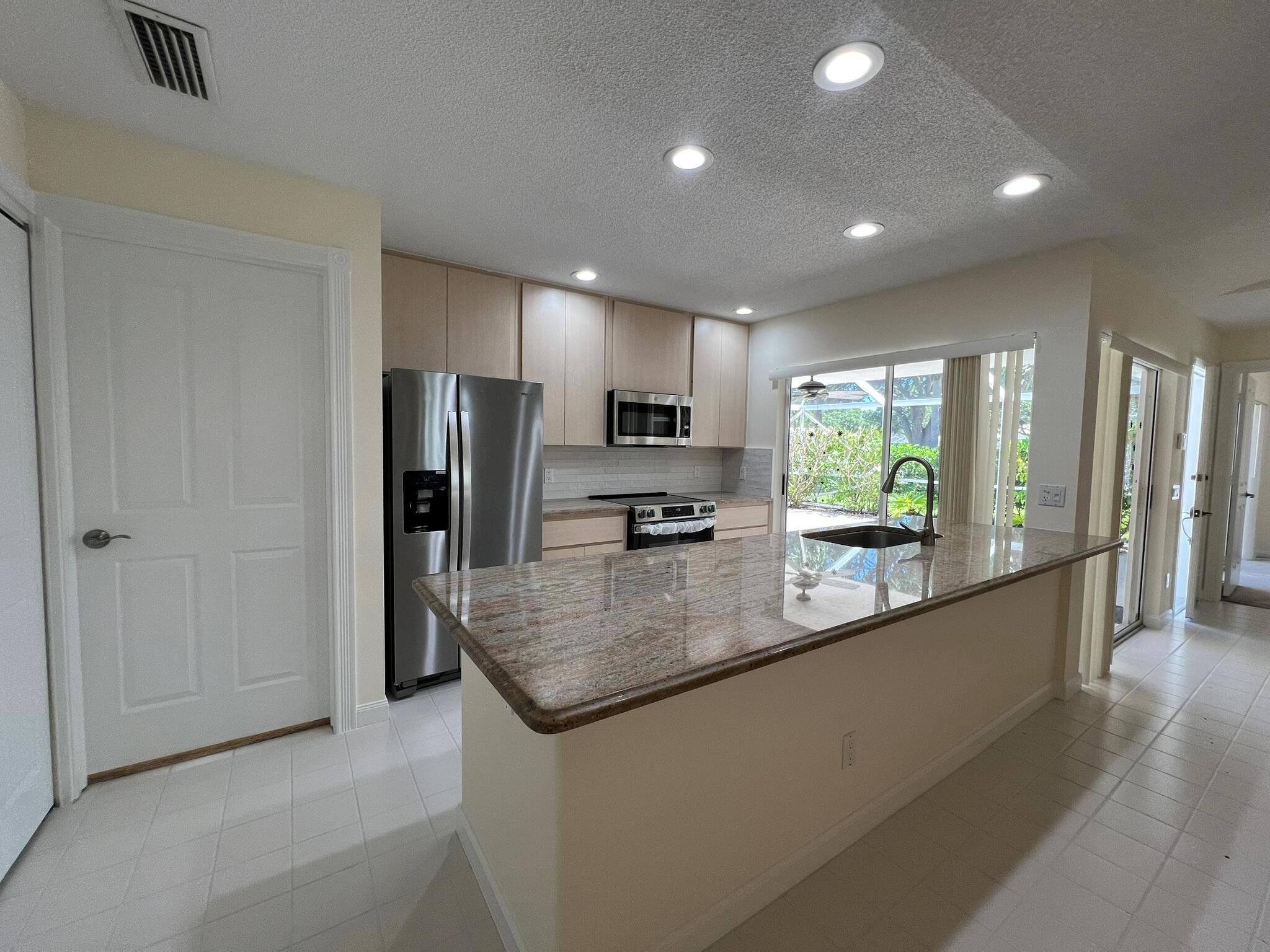 Pristine newly painted & well maintained single level 2 bedroom, 2 bathroom townhome offers open living/dining areas, soaring ceilings, custom shelving, mirrors, & elegant finishes throughout. The recently updated kitchen is a chef's delight, featuring BRAND NEW appliances, marble countertops, and abundant storage space. Both spacious bedrooms offer easy access and include their own full bathrooms, providing comfort and privacy. Step outside onto the oversized screened-in patio ideal for relaxing or entertaining. Enjoy access to the community pool, scenic tree-lined g paths, & tranquil lakes. Sunterrace is located just minutes from the upscale Gardens Mall, fine dining, pristine beaches, & major highways. This home is the perfect blend of serenity and convenience. See for yourself