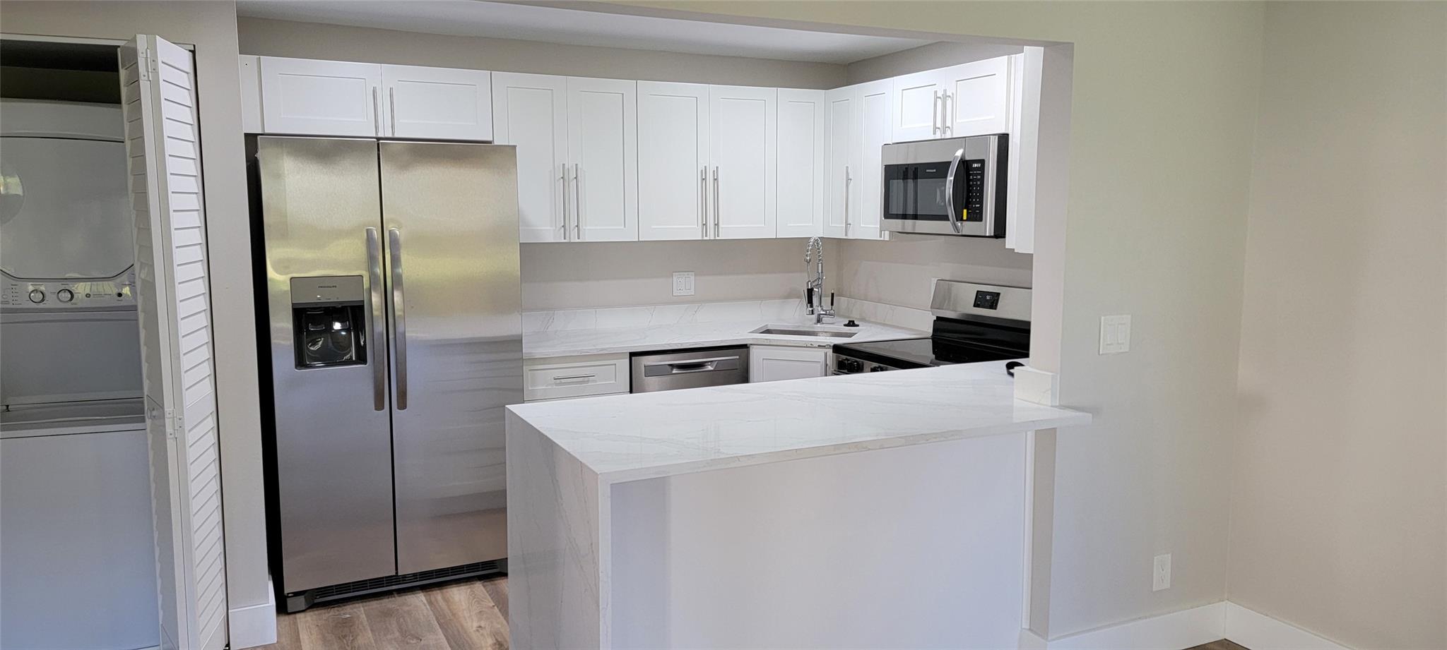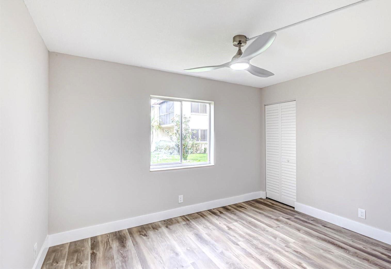 BEAUTIFUL & FULLY RENOVATED 1ST-FLOOR CONDO! This updated 2-bed, 2-bath condo offers modern elegance and is privately nestled among lush greenery. Enjoy new vinyl plank flooring and smooth, popcorn-free ceilings throughout. Freshly painted with new baseboards, closet doors, fans, and fixtures, it features a renovated kitchen with wood shaker cabinets, Quartz countertops, LED recessed lighting, and stainless steel Frigidaire appliances. A separate laundry closet includes a washer and dryer. Sunlit dining and living areas boast corner windows and sliding glass doors. The spacious master suite offers a walk-in closet, while the renovated bath includes a custom vanity, Quartz counters, decorative tile flooring, and a frameless glass shower.