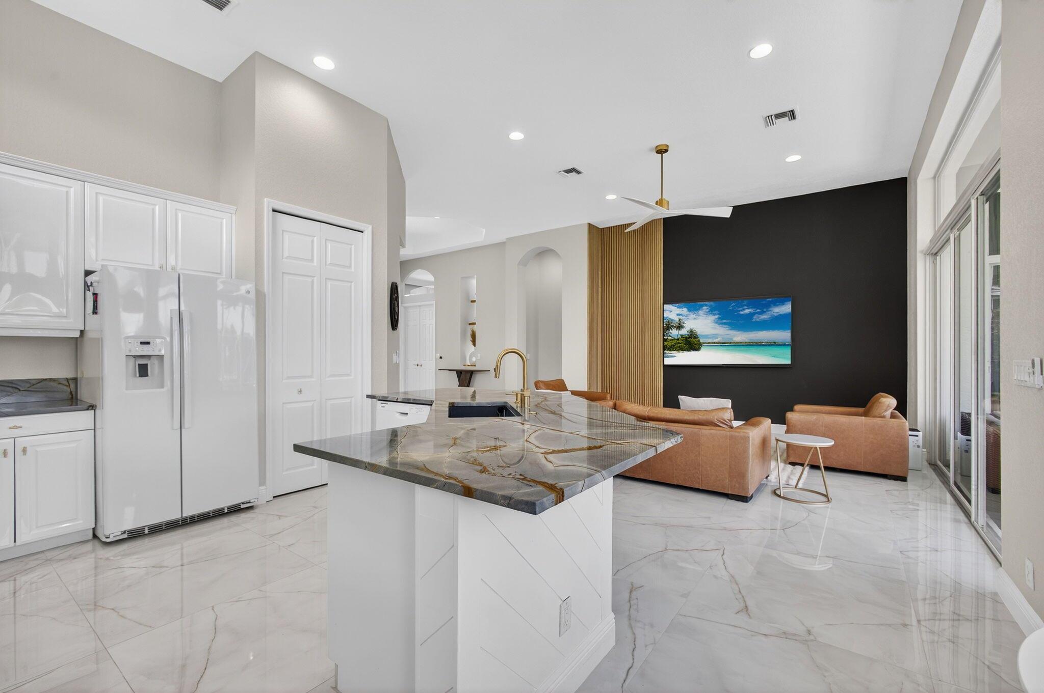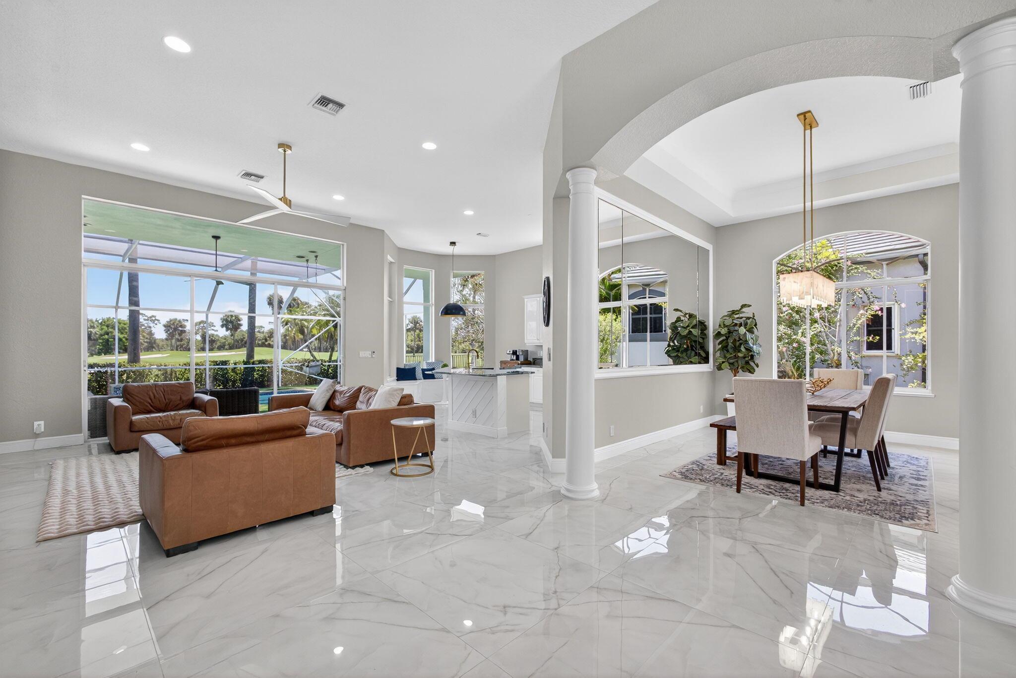 Set on a private cul-de-sac in the boutique Ironhorse community, this updated 4-bedroom, 4-bath ranch styled home offers panoramic views of the preserve, & the renowned Arthur Hills Championship golf course, with no mandatory membership. Be captivated by the 12-ft ceilings with abundant natural light, elegant new porcelain tile floors throughout, a brand-new roof (2024), new A/C, new pool heater, new water heater, new pool pump, new impact double front door, extended driveway & fresh interior & exterior paint. The open-concept kitchen with quartz countertops, a built-in breakfast nook, & a shiplap-accented island, flowing into spacious living areas framed by custom wood panel media wall & sweeping golf views, while the primary suite boasts custom his & hers closets & a spa-style bath.