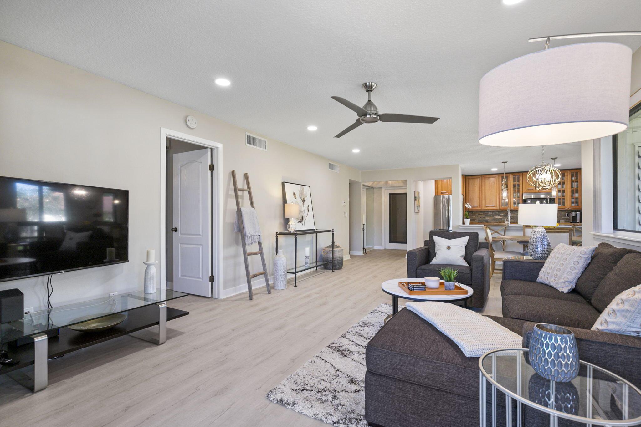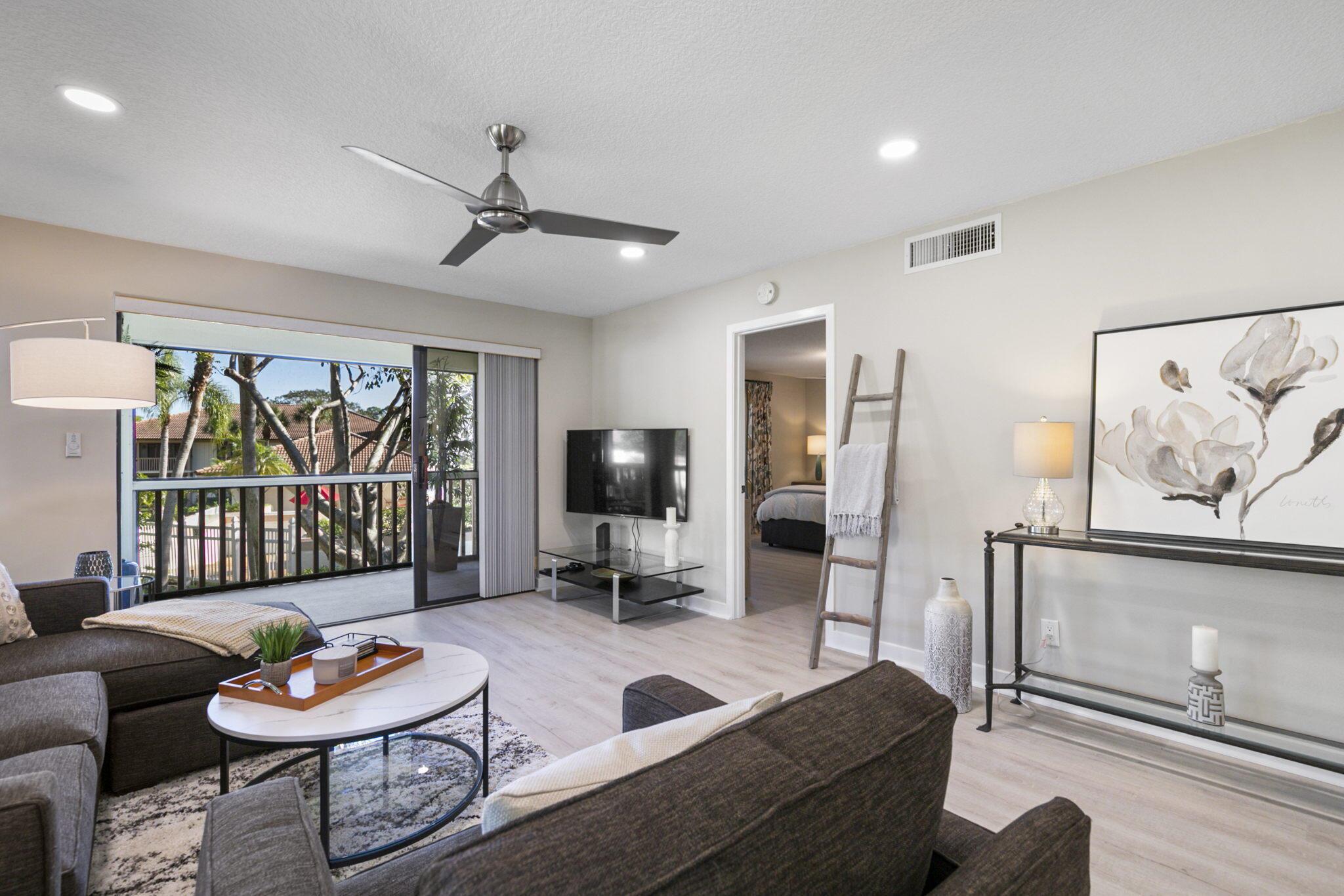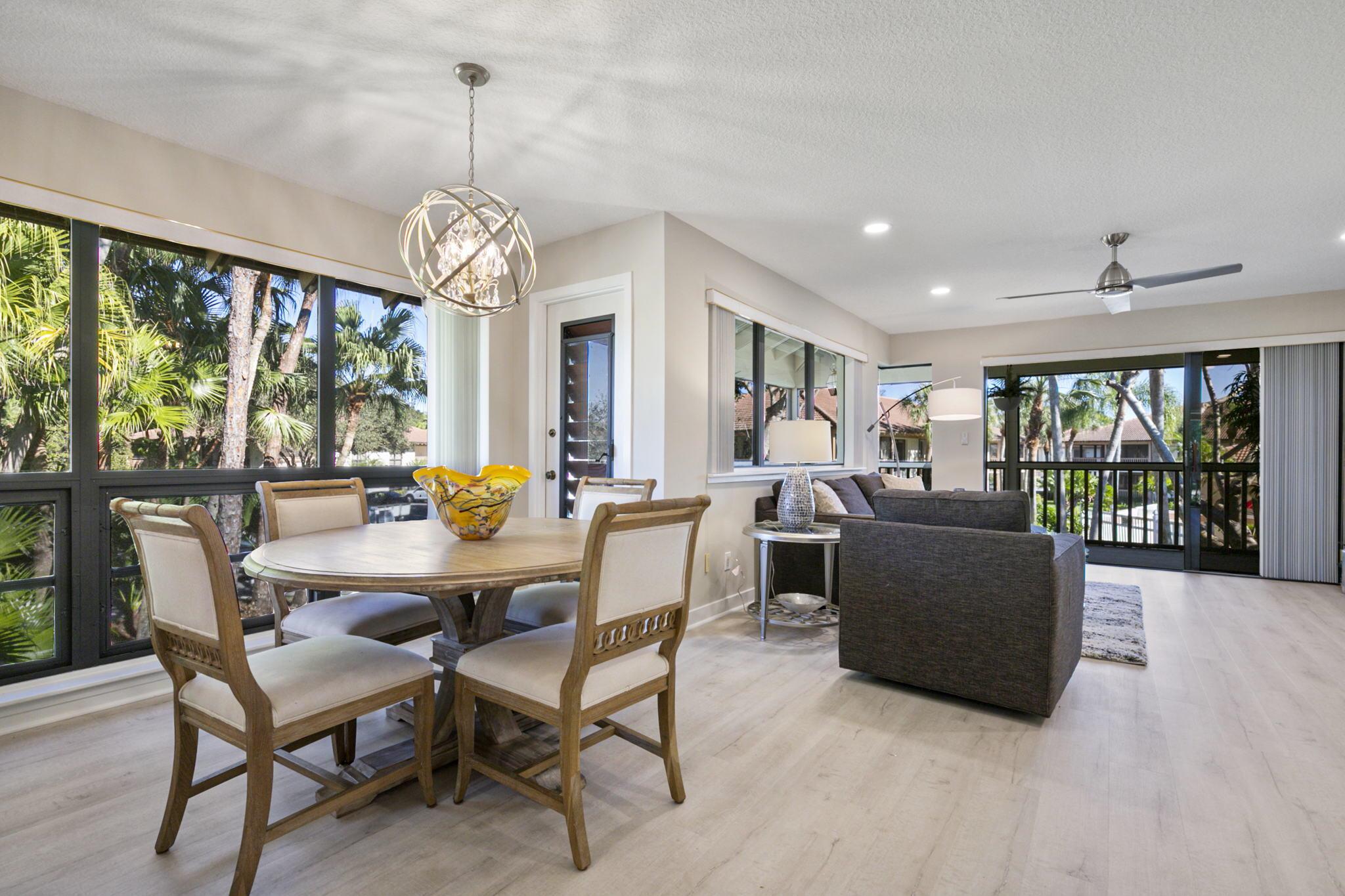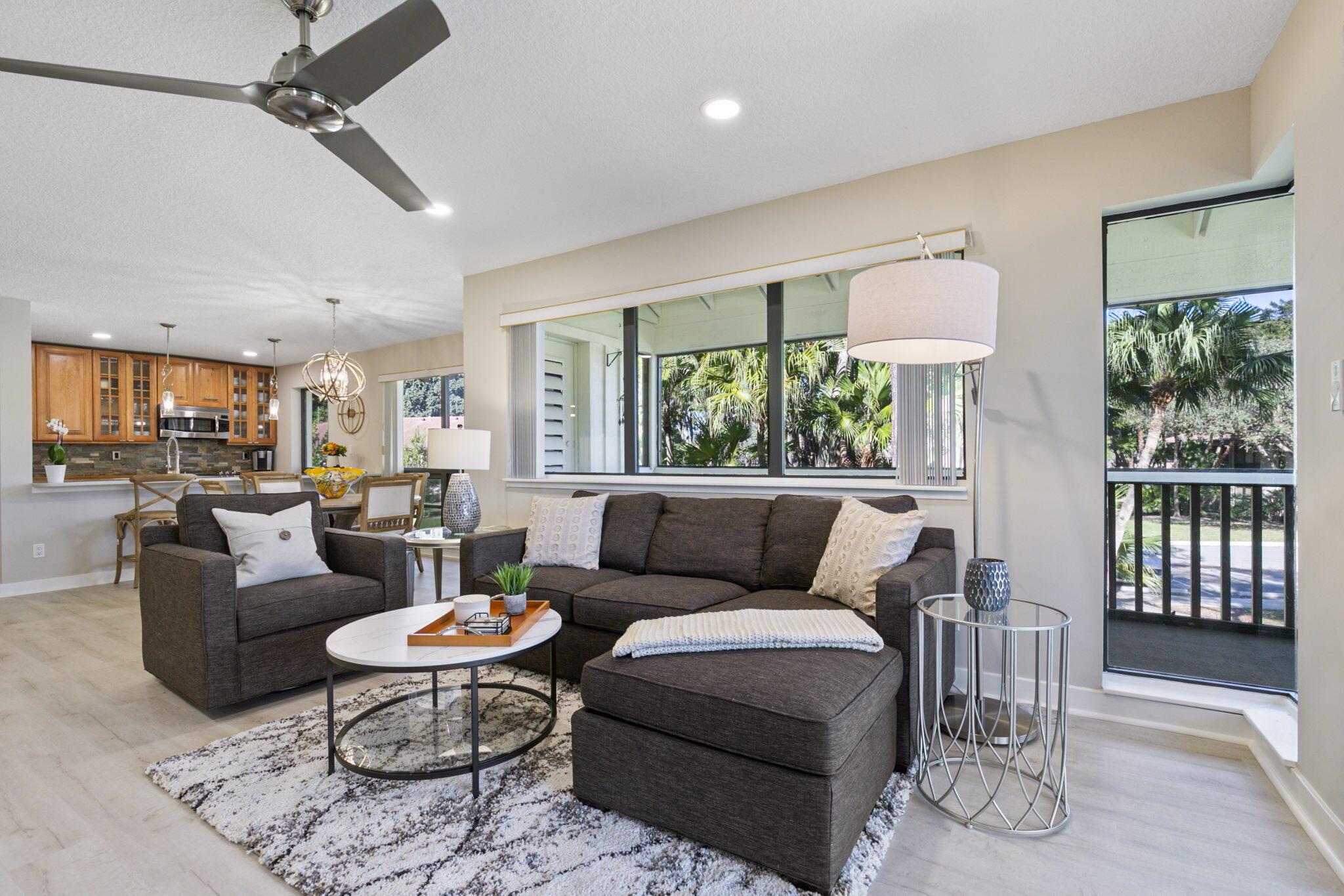 Spend Nov & Dec in this exquisite end unit in the heart of PGA National, where every detail has been thoughtfully curated for comfort & style. Step inside to discover luxury vinyl wood-look flooring throughout, complemented by tiled bathrooms. The fully equipped kitchen, features a quartz countertop w/ stainless steel appliances & front load washer & dryer . This culinary space is not only functional but social, with bar stool seating that seamlessly integrates with the open dining & living areas.Interior & exterior ceiling fans create a bright and airy atmosphere. Elegantly decorated in a modern, relaxing style, this home is furnished to comfortably sleep four.Sip your morning coffee/evening wine on the private, fully screened wrap-around lanai, where tranquility is your backdrop