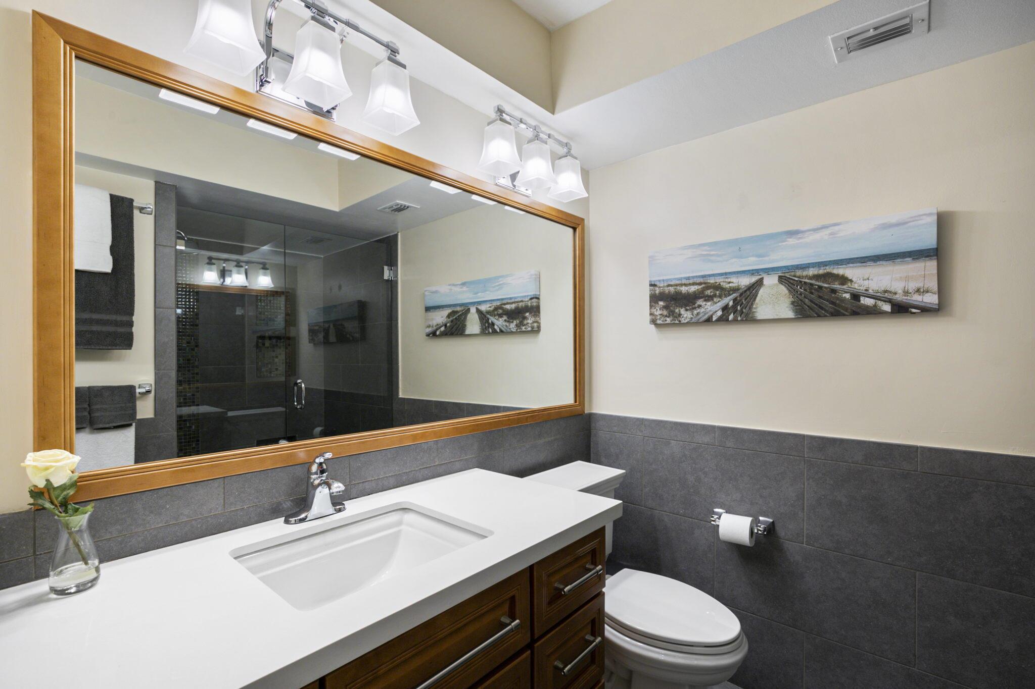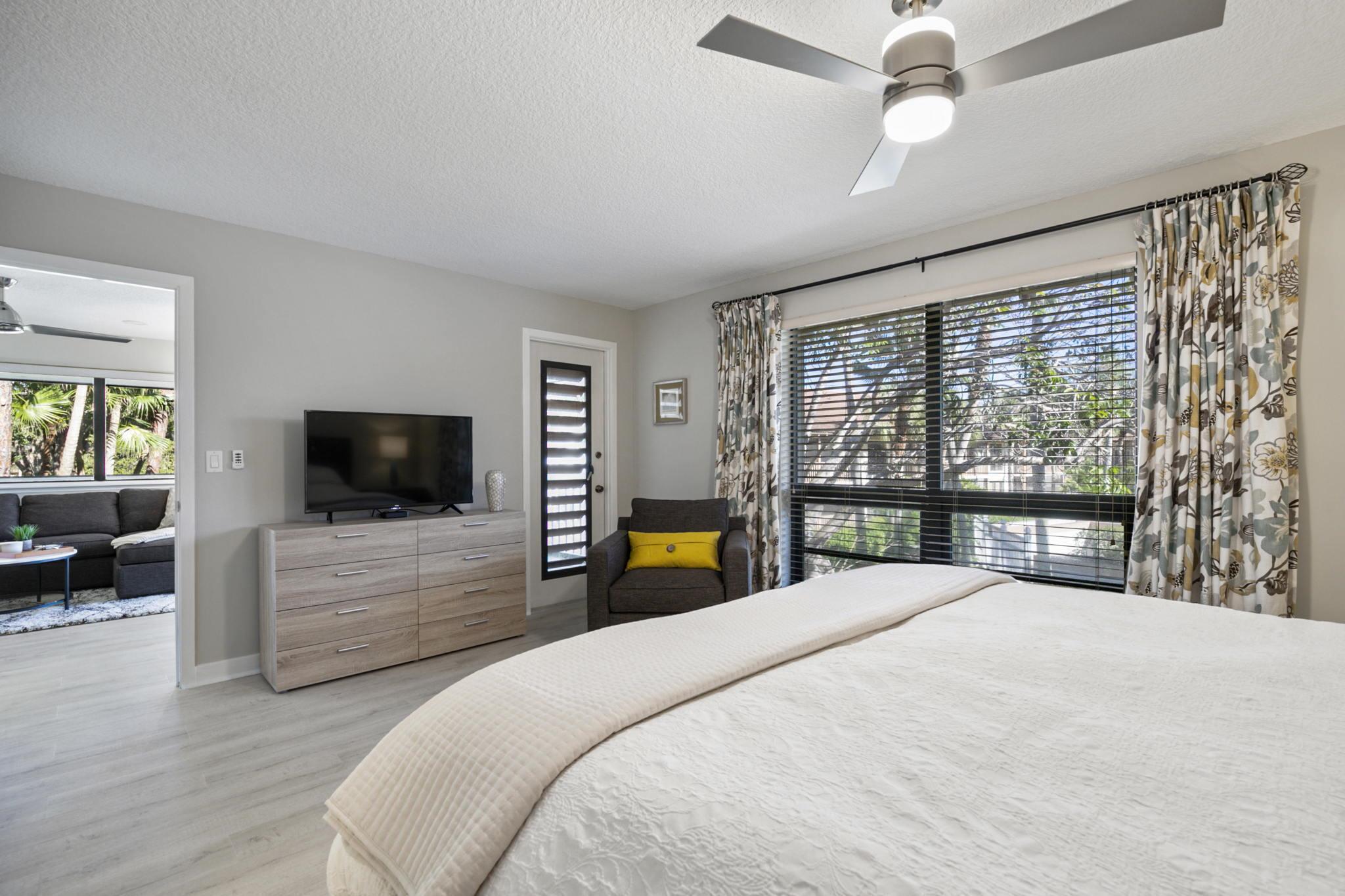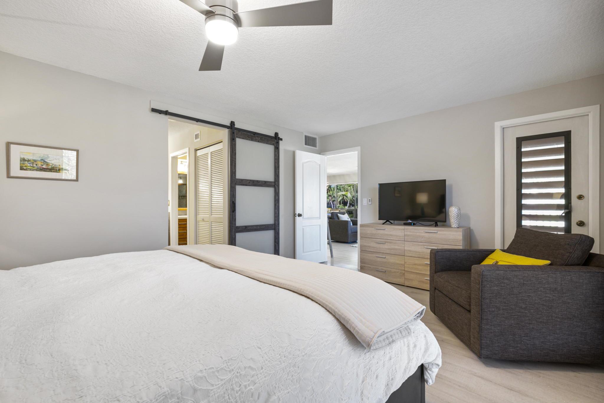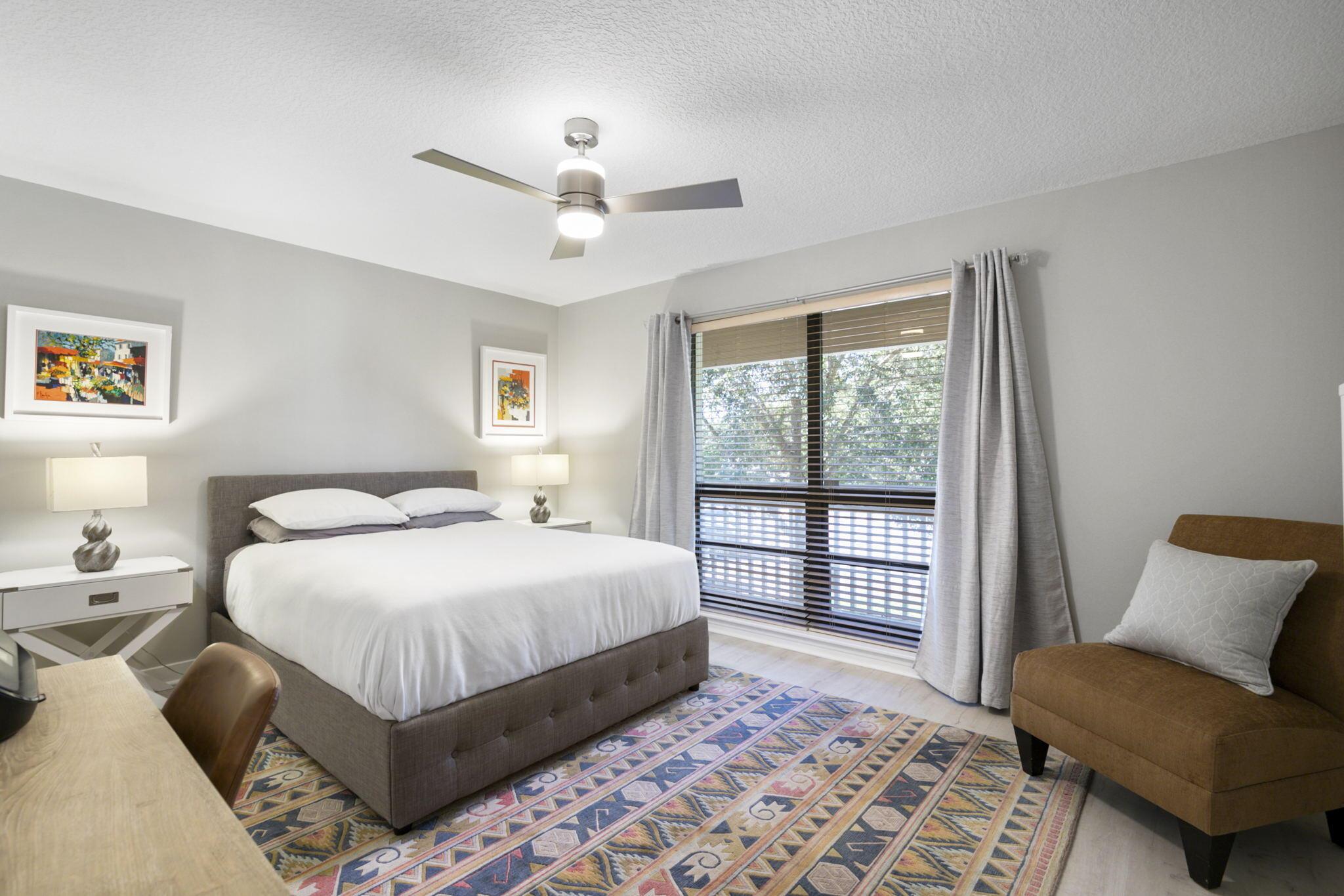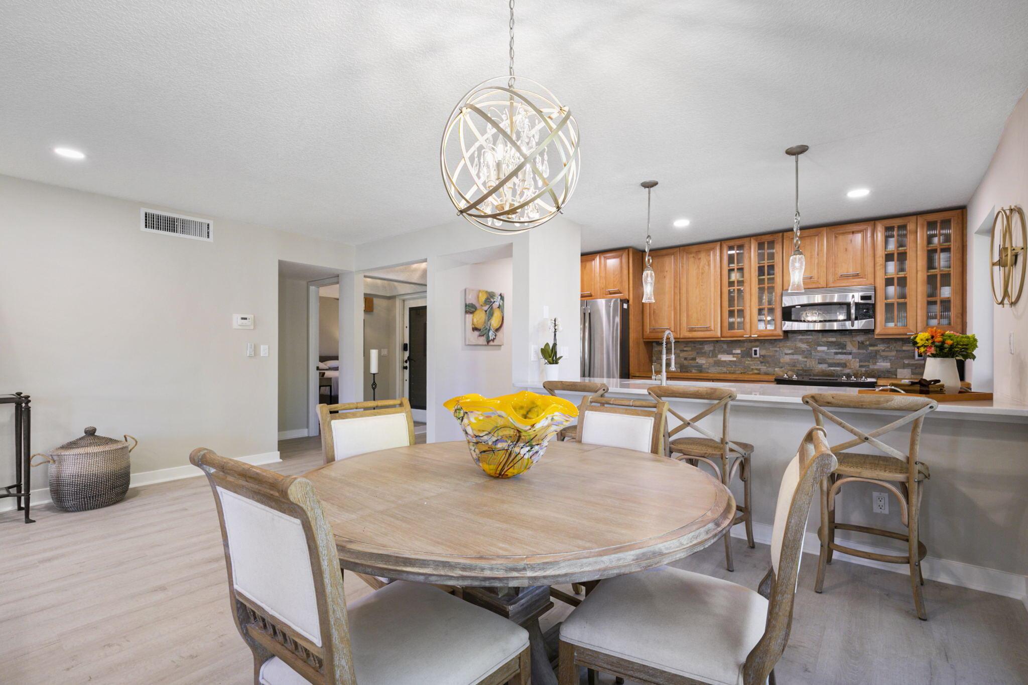 Spend Nov & Dec in this exquisite end unit in the heart of PGA National, where every detail has been thoughtfully curated for comfort & style. Step inside to discover luxury vinyl wood-look flooring throughout, complemented by tiled bathrooms. The fully equipped kitchen, features a quartz countertop w/ stainless steel appliances & front load washer & dryer . This culinary space is not only functional but social, with bar stool seating that seamlessly integrates with the open dining & living areas.Interior & exterior ceiling fans create a bright and airy atmosphere. Elegantly decorated in a modern, relaxing style, this home is furnished to comfortably sleep four.Sip your morning coffee/evening wine on the private, fully screened wrap-around lanai, where tranquility is your backdrop