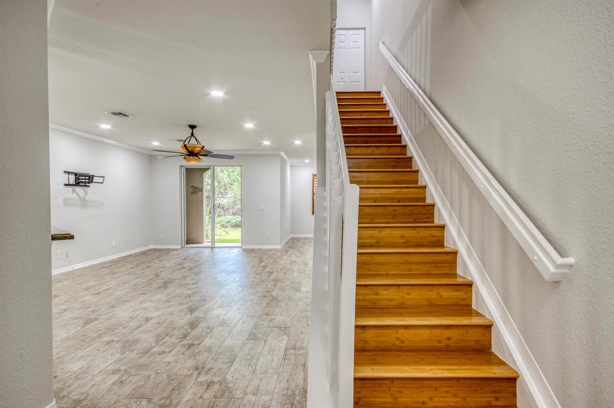 This beautiful 3-bedroom, 2.5-bath townhouse is located in a gated community and offers numerous upgrades throughout. The kitchen features stainless steel appliances and granite countertops, complemented by freshly painted interiors and newly added recessed lighting for a modern touch. The spacious family room is perfect for entertaining, while the primary bedroom easily fits a king-size bed and includes a large walk-in closet, abundant natural light, and a luxurious en-suite bathroom. Rustic wood-look porcelain tile floors run throughout the home, creating a warm, contemporary feel. Step outside to a private and spacious back patio, now featuring brand-new turf, ideal for relaxing or entertaining. Enjoy the peaceful sounds of birds from the nearby sanctuary as you unwind in this