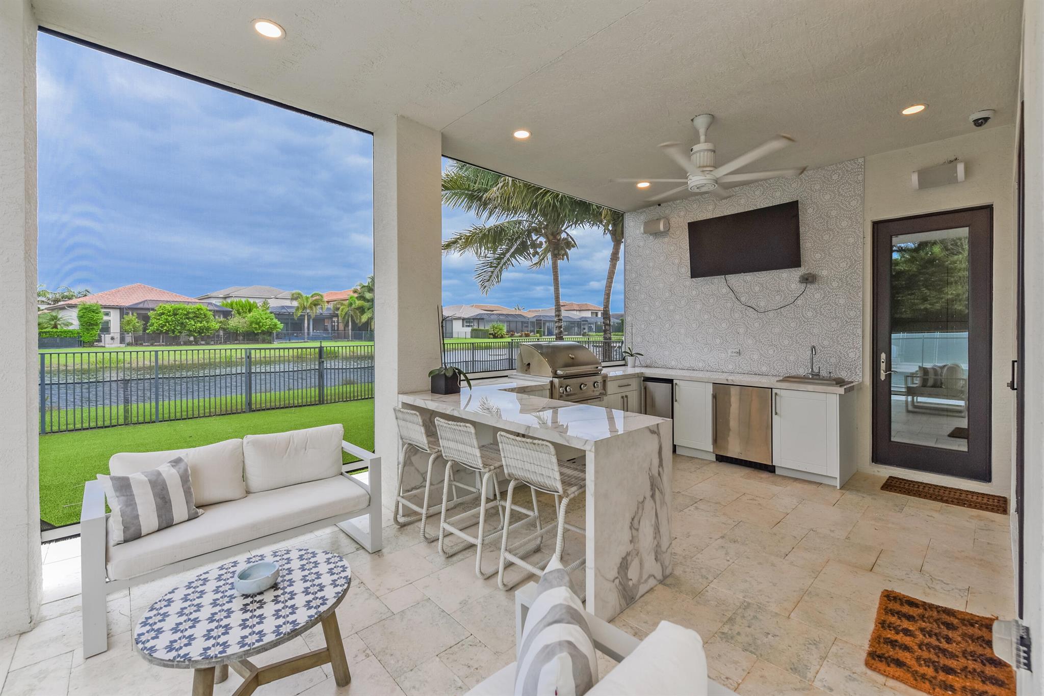 This Stunning upgraded Mediterranean style pool home is an entertainer's dream. Located in the amenity-rich community of Seven Bridges in Delray. Situated at the end of the cult-de-sac with a water view allowing for lots of privacy. Enter into the spacious living area where you will find a floor to ceiling fireplace as well as impact windows which allow for plenty of light. The guest Bedroom and Bath are conveniently located on the first floor along with 2 Baths that are situated in the Office and Family room. There are Five full Bedrooms on the second level all with adjoining Baths. The Kitchen is a Chefs delight complete with an upgraded Jennair Refrigerator, Gas Stove, and a Uline Beverage Refrigerator. An extra large Pantry and plenty of Counter space completes this fabulous Kitchen