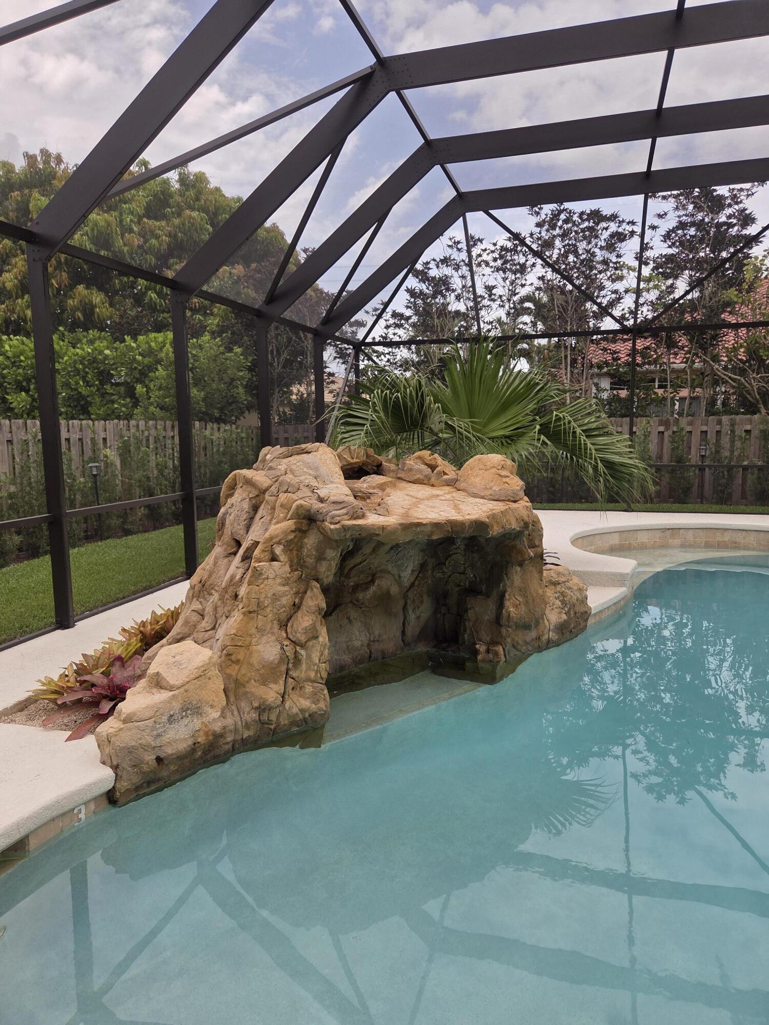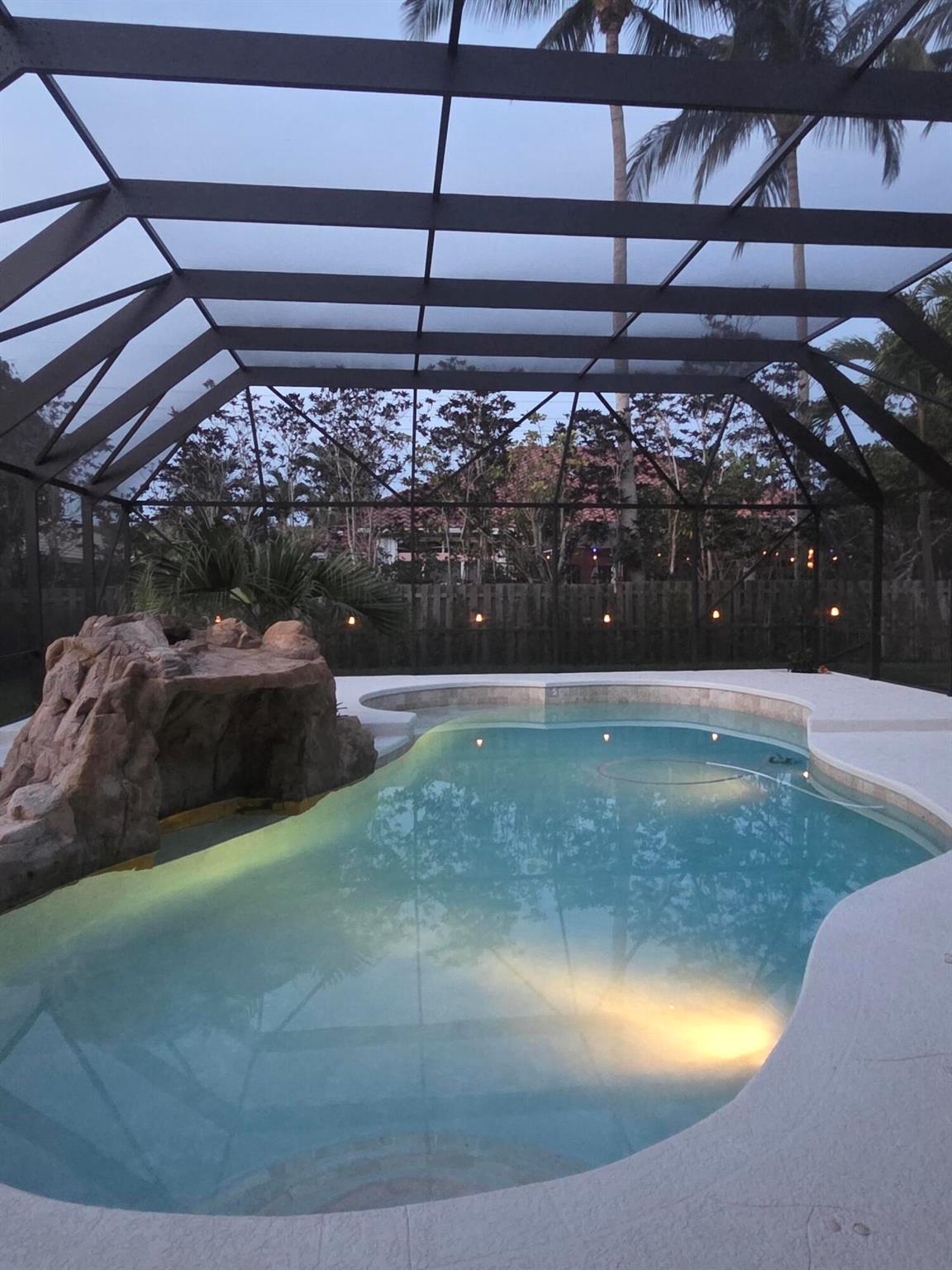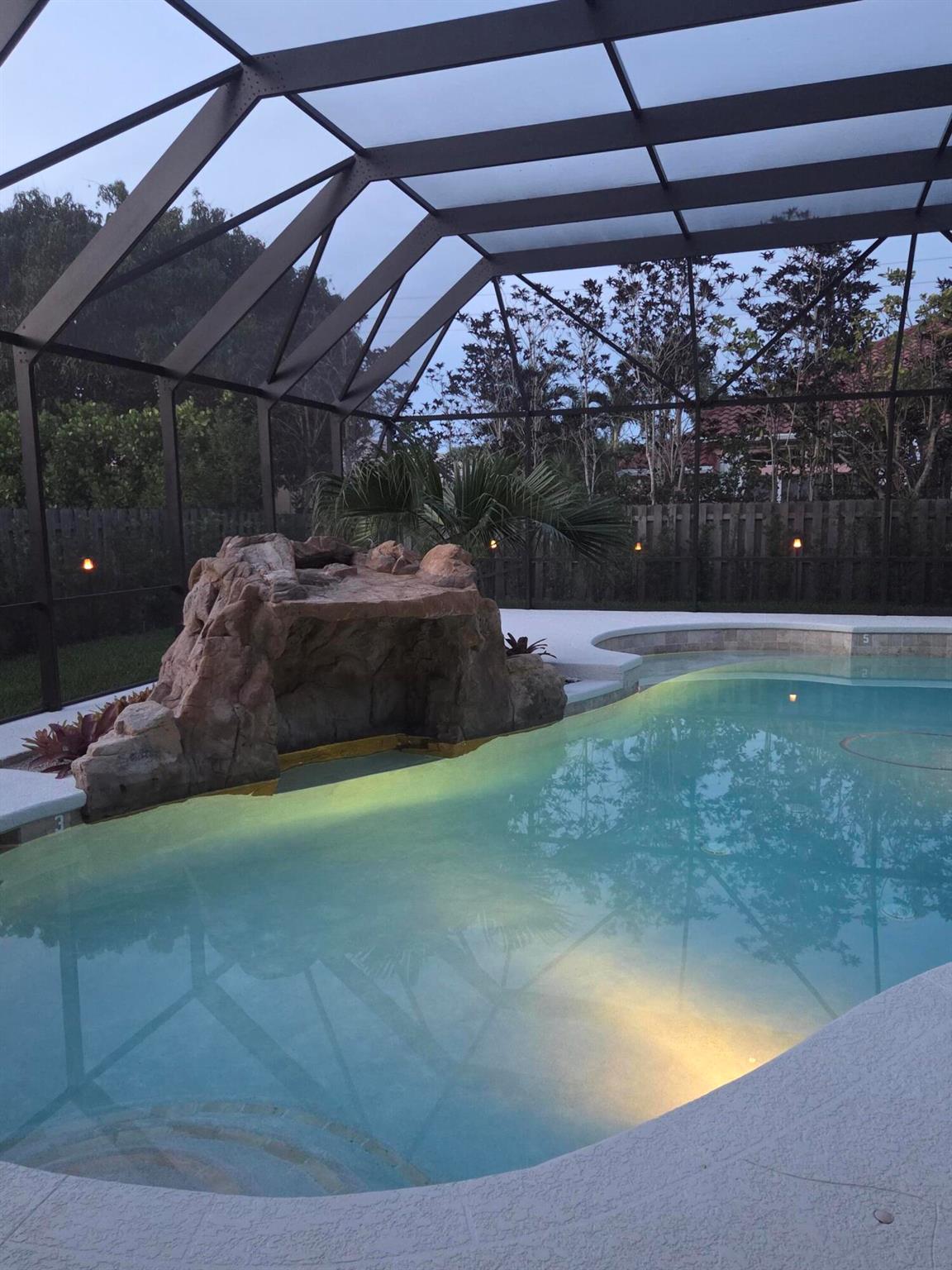 Beautiful, private waterfall grotto pool home is ready to be your oasis. With 4 BR's, 3 BA's, 3 car garage, LR, DR, FR and an office. Large fenced in yard lined with Podocarpus hedge for total privacy and a mature avocado tree, this home checks all the boxes. Solidly built with foam filled CBS construction with double pane hurricane windows, it features 9 ft ceilings in the BR's/BA's, 12 ft ceiling in main rooms and 14 ft ceiling in the entry making all the rooms feel huge. The oversized saltwater pool features a sun shelf, waterfall grotto with seating, and new heat pump. Freshly painted and upgrades galore. Situated on a quiet cul-de-sac street with no power poles or high voltage lines, just 3 miles from I-95. In Martin County with a Jupiter address, the neighborhood offers tennis