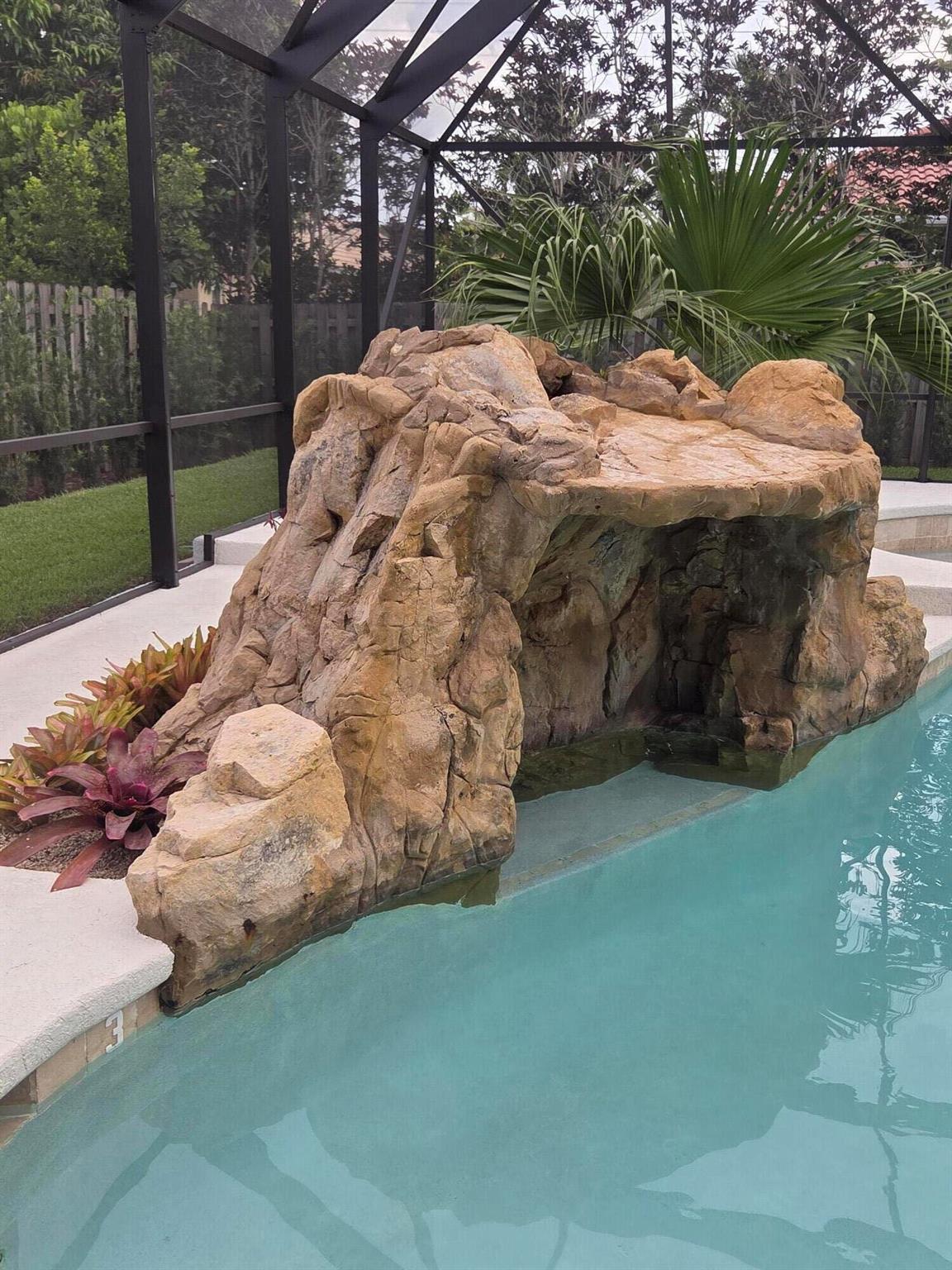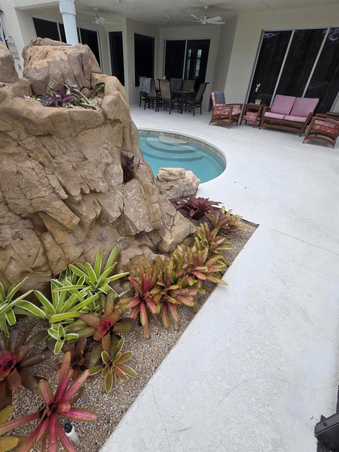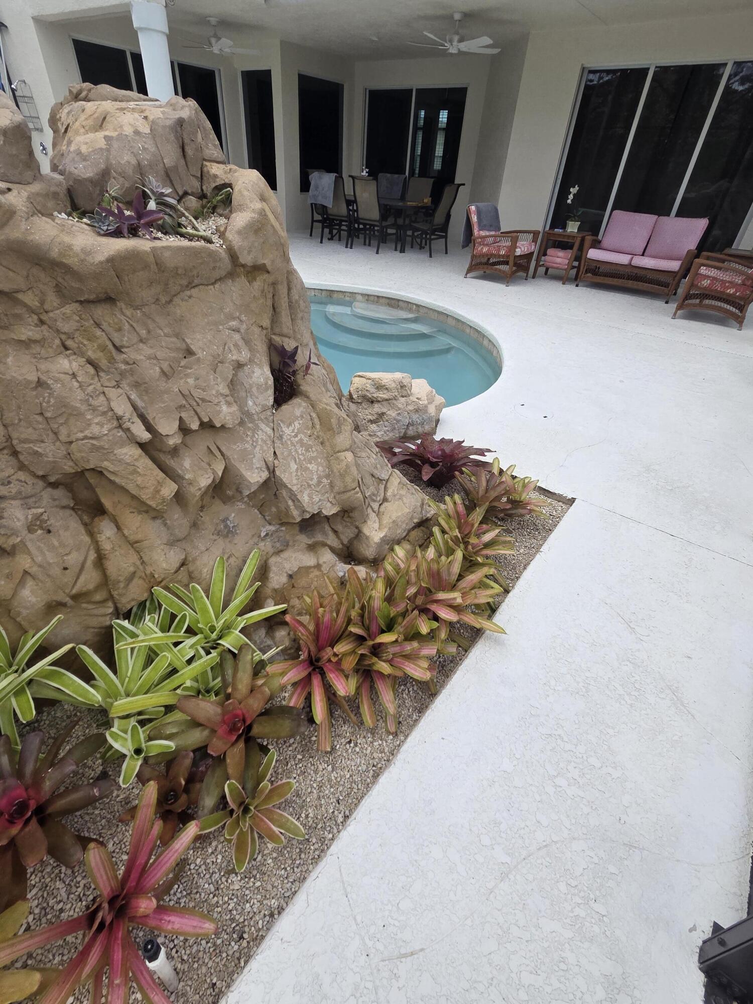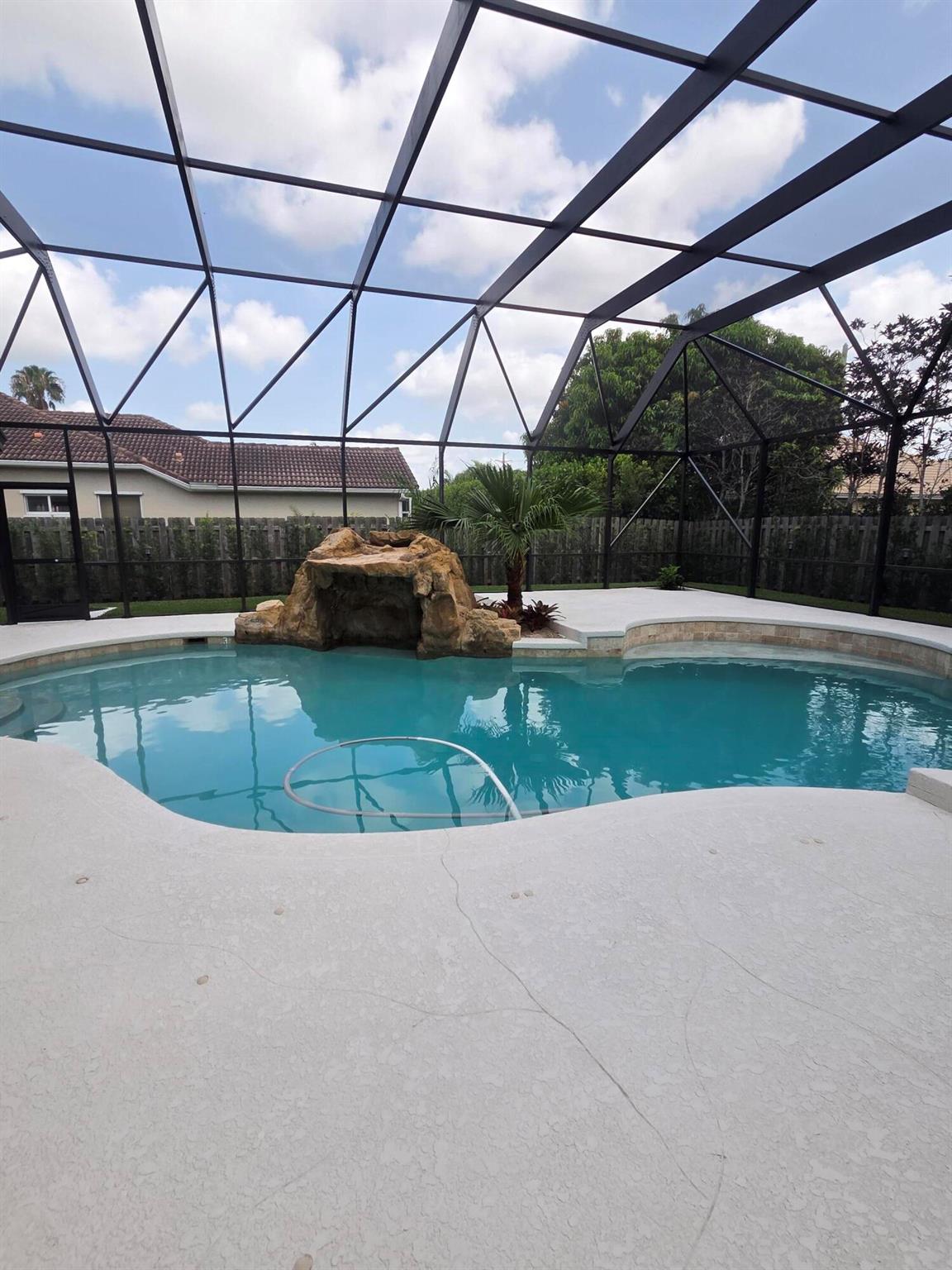Beautiful, private waterfall grotto pool home is ready to be your oasis. With 4 BR's, 3 BA's, 3 car garage, LR, DR, FR and an office. Large fenced in yard lined with Podocarpus hedge for total privacy and a mature avocado tree, this home checks all the boxes. Solidly built with foam filled CBS construction with double pane hurricane windows, it features 9 ft ceilings in the BR's/BA's, 12 ft ceiling in main rooms and 14 ft ceiling in the entry making all the rooms feel huge. The oversized saltwater pool features a sun shelf, waterfall grotto with seating, and new heat pump. Freshly painted and upgrades galore. Situated on a quiet cul-de-sac street with no power poles or high voltage lines, just 3 miles from I-95. In Martin County with a Jupiter address, the neighborhood offers tennis