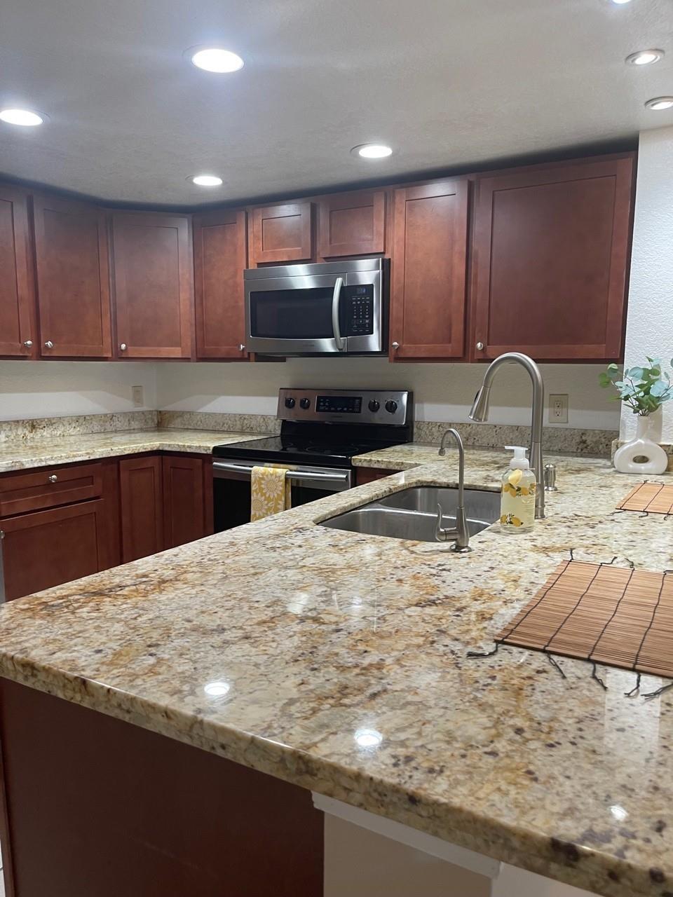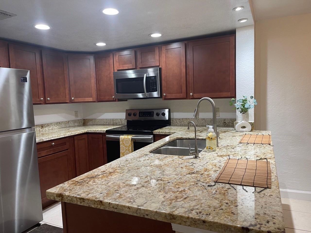 This GEM of a condo is available for rent! Gorgeous updated 2BD/2.5BA condo w/ balcony overlooking a beautiful lake and fountain!! Unique 2nd floor entry features its own 2-story living layout. Talk about space, this has it! Spacious open-concept kitchen, lovely wood-finish cabinets and granite island-style countertops. Tile and laminate flooring throughout. Large living/dining area plus bonus under-stairs nook, perfect for a desk or floor décor, or nothing at all! Half bath on first floor for your guests. second floor: Primary bedroom with en-suite bathroom w/shower. 2nd bedroom and 1 full bath/shower combo in hallway. Dedicated laundry w/ washer/dryer. Move-in ready. Don't miss this opportunity at this price! This is one rental that never disappoints!