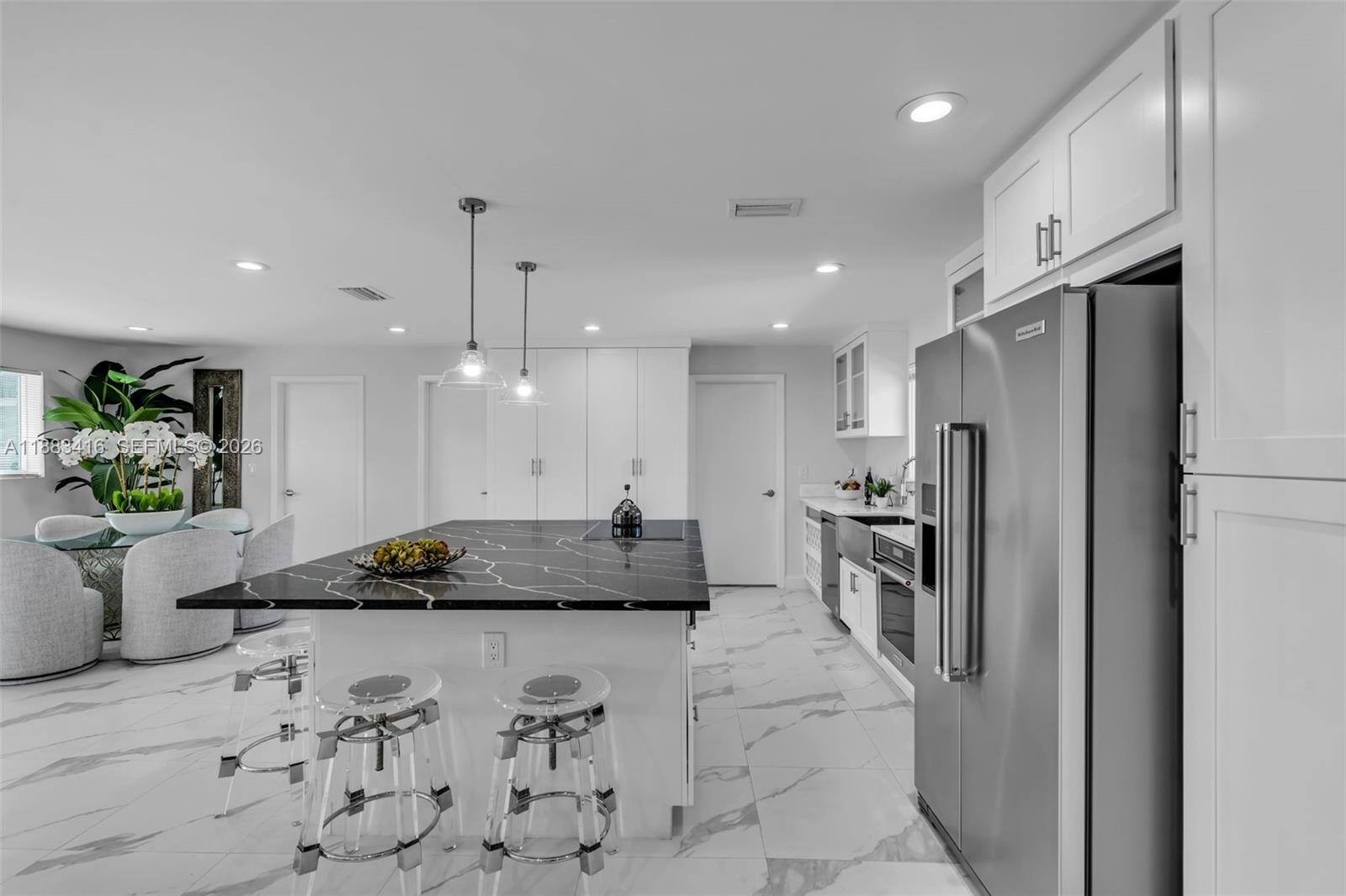 Beautiful renovated home, all in one level with pool, on East Boca Raton with high walkability factor. Walk to tennis or Mizner Park shops and restaurants. Spacious one level 4bed/ 2.5 bath and large open dining/living/family room. New kitchen with quartz countertops and all fully equipped new appliances. Hurricane impact windows throughout, landscaped backyard, circular driveway/new pavers, frameless shower doors, separate laundry room, small garage for small vehicle or storage. Available starting November 2nd, 2025