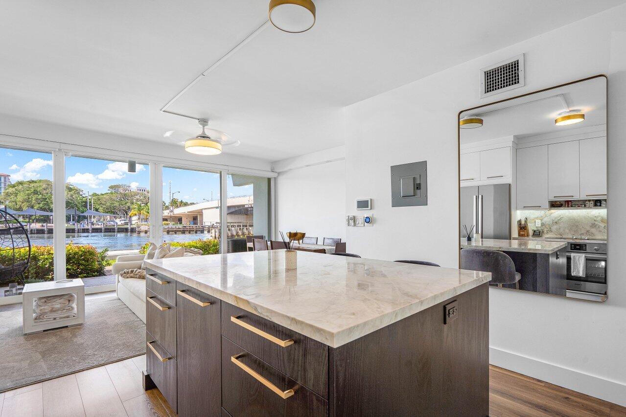 Stunning, waterfront 1 bedroom, 1 bath condo with spectacular intracoastal views! This East Boca condo is in a recently renovated building surrounded by multimillion dollar single family homes and walking distance to the beach and everything downtown Boca Raton has to offer. Recent upgrades include impact doors and windows, electronic shades, and genetic hardwood floors throughout. Gourmet kitchen with gorgeous, oversized island, soft shut drawers, custom built cabinets with under cabinet lighting, and Bosch appliances. Bathroom features Carrara marble, Kohler fixtures, heated TOTO toilet, large, recessed medicine cabinet with LED lighting and plenty of storage.