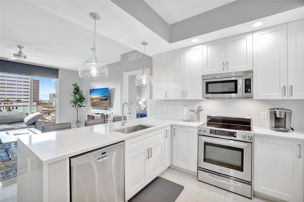 Totally Renovated and Remolded! Pristine Condition! One Bedroom& 1.5 Baths in the Center of Downtown! Located in a 5 Star Luxury Building, this Fully Furnished Condo features modern Finishes and Sparkling City Views! Appointed with Tile Floors Throughout, Modern kitchen with Stainless Steel Appliances, Large Primary Bedroom with Walk-in Closet, Spa Like Bath with Glass walk-in Shower and Free Standing Tub, Motorized Window Treatments & Full Size Stackable Washer/Dryer, 2022 HVAC. Enjoy City and Pool Views from the Large Terrace. One Assigned Garage Space , extra is available for additional charge. Located in the Trendy Flagler Neighborhood, with restaurants and Bars! Close to Las Olas, the Beach and More! 24-hr valet & attended lobby, pool, hot tub, gym, business center, social room.