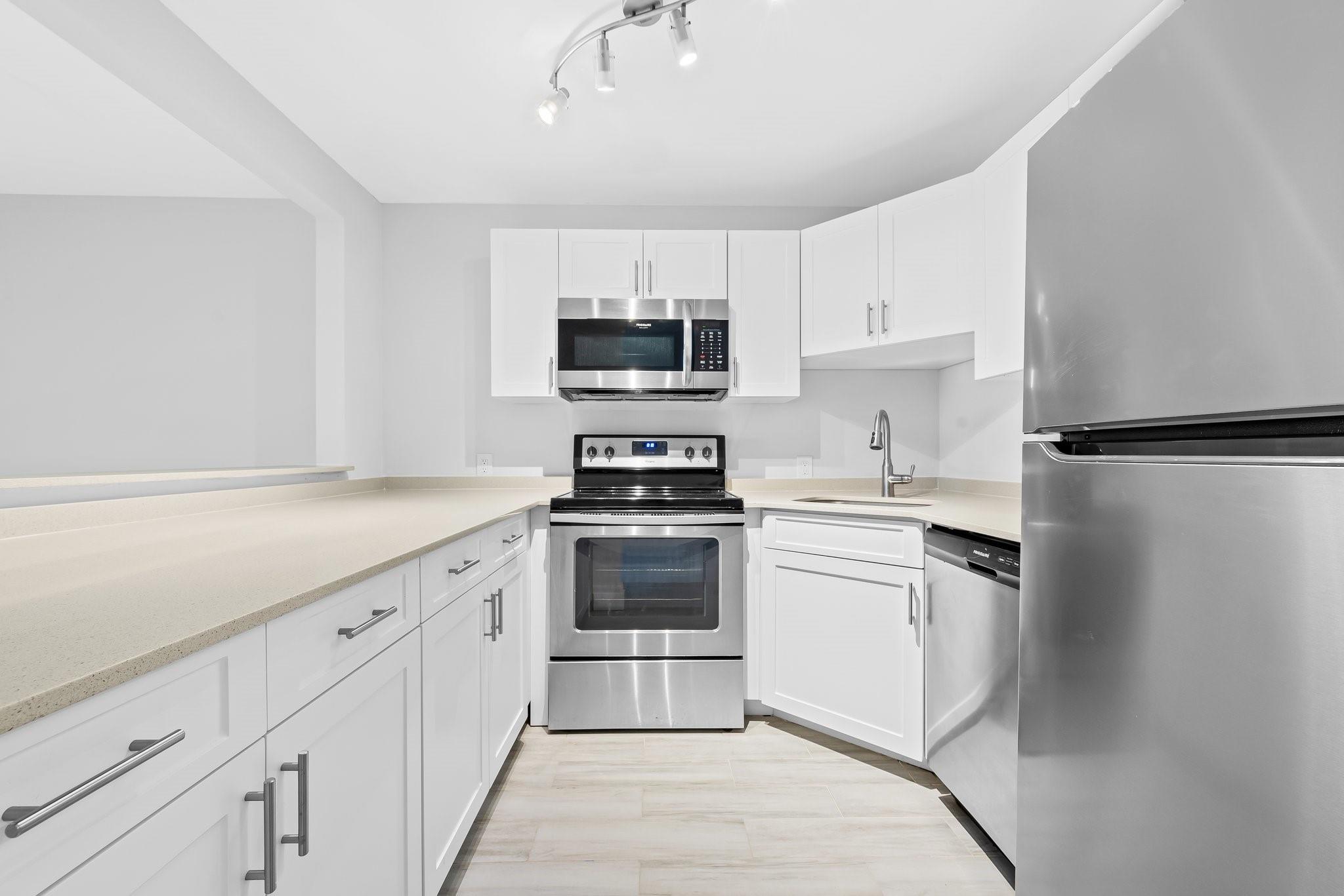 COZY 1 BEDROOM APARTMENT 2 BLOCKS FROM THE BEACH! HIGH QUALITY DESIGNER TILE. NEWER PAINT. WHITE SHAKER CABINETS WITH QUARTZ COUNTER TOPS. STAINLESS STEEL APPLIANCES WITH A DISHWASHER SIZE WASHER AND DRYER INSIDE THE UNIT. SLIDING GLASS DOORS OPEN UP TO A PRIVATE PATIO. CENTRAL A/C.