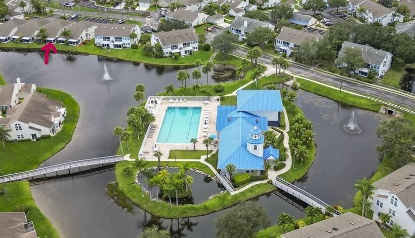 Seasonal gem! Nicely furnished, lakeside condo w/garage in attractive, sprawling community! Huge heated pool, clubhouse, pickleball/tennis courts & fitness center! Convenient to I-95, shopping, restaurants & golf. Just 8 miles to beach! Downstairs bedroom & full bath, plus large bedroom, den & full bath upstairs. Pleasant ,eat-in kitchen! Screened, lakeside porch w/fountain views! Full-sized laundry. Must see! (3rd bedroom w/cutout overlooking living room has futon but inaccessible closet; is considered as den) Utilities included up to $125 elec + $50 water/sewer per month.