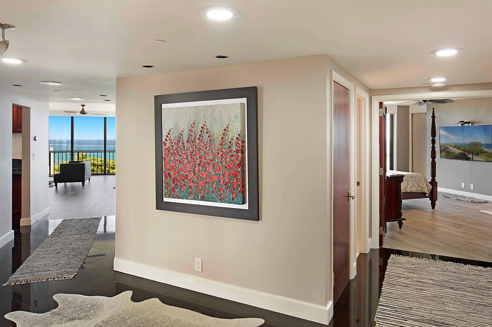 This is a RARE opportunity to rent a half-floor residence with unmatched panoramic ocean views in the exclusive, boutique building of The Ocean Club in Boca Raton. Owning 300 feet of private beach and with only 2 units per floor, 15 total units in the building, The Ocean Club is coveted and exceptionally desirable. This spacious, open, light and bright, 3 bedroom/3 bath condo has been beautifully remodeled and converted to a 2 bed/2.5 bath + expanded living area, which can easily be converted back to a 3 bedroom should renter desire. With 2,490 sf of living space, an open split bedroom floorplan, black marble and driftwood porcelain flooring, an abundance of floor-to ceiling impact windows and doors, and 3 separate balconies (one screen enclosed) off of the large living areas and