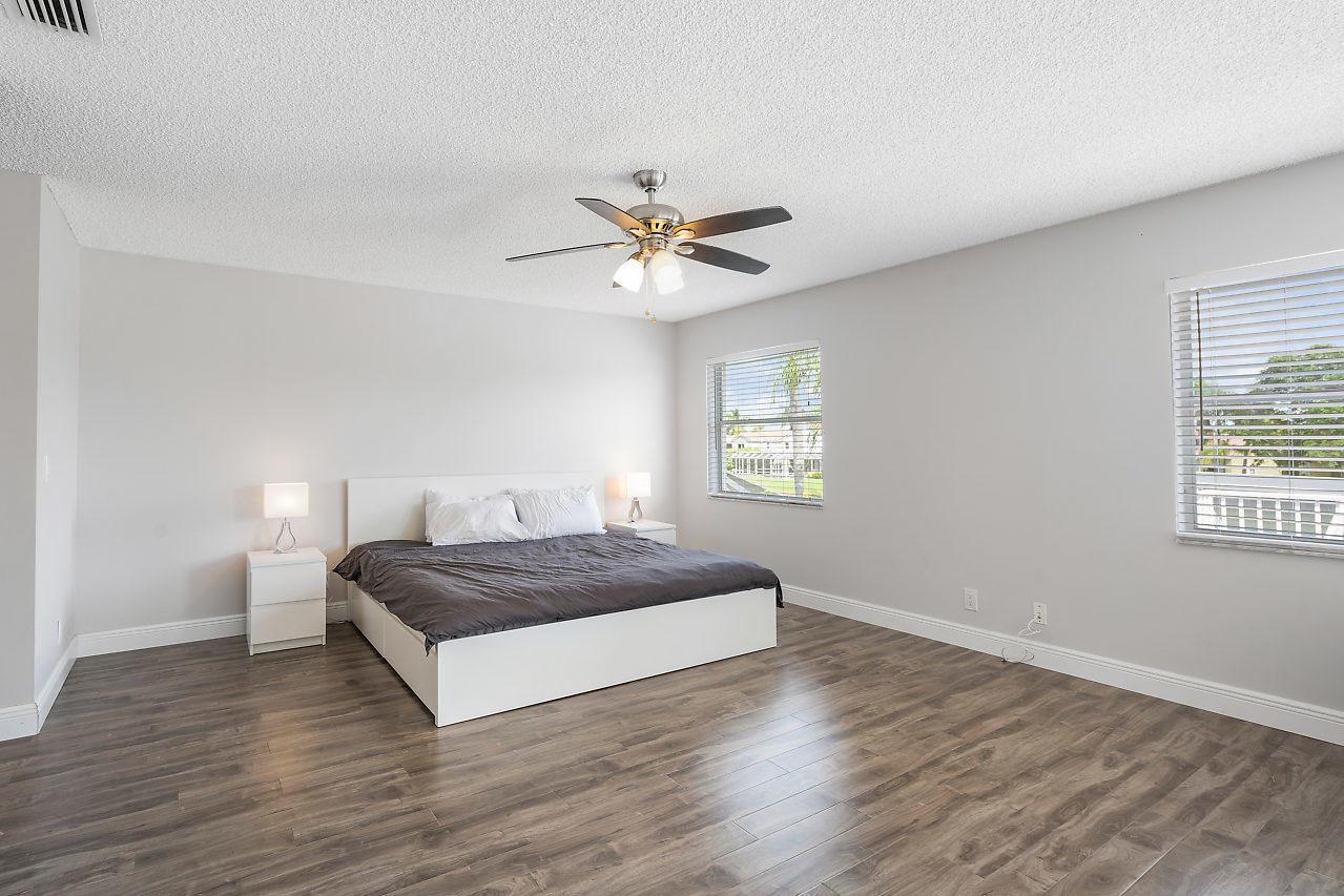 Beautifully renovated, unfurnished contemporary 4BR/3BA, 3 car garage, 2 story pool home on water in 24 hour man gated Boca Raton community. This light and bright home features lots of windows, NO carpeting, open floor plan and lovely water views! Modern kitchen with white wood shaker style cabinets, french door fridge, quartz counters, and is open to large family room and overlooks gorgeous pool (newly redone) and yard. Oversized master BR with huge closets, private balcony and sitting area and 3 generous sized rooms upstairs. Ceiling fans in all bedrooms. Pets considered on case by case basis. Fabulous all age community has a pool, gym, clubhouse, tennis, billiards room. Cable, lawn and pool care included.