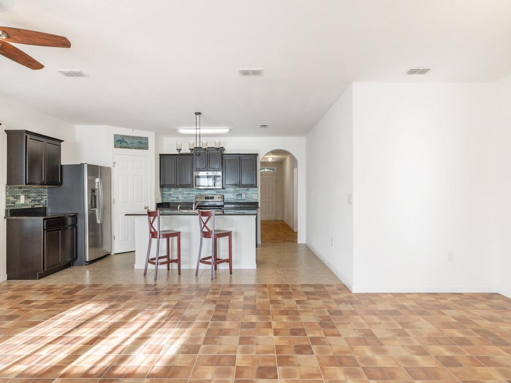 Enjoy peaceful mornings on your covered patio overlooking the tranquil lake. This beautifully maintained 4-bedroom, 2-bath, 2-car garage home sits on one of the largest lots in this sought-after gated community, offering both space and serenity. The open floor plan features tile throughout, a modern kitchen with granite countertops, and stainless steel appliances--blending comfort and style seamlessly. Both bathrooms include matching granite finishes for a cohesive, upscale look. With lawn care included, this property offers effortless living in a well-kept neighborhood. This home has been lovingly cared for--come see for yourself!