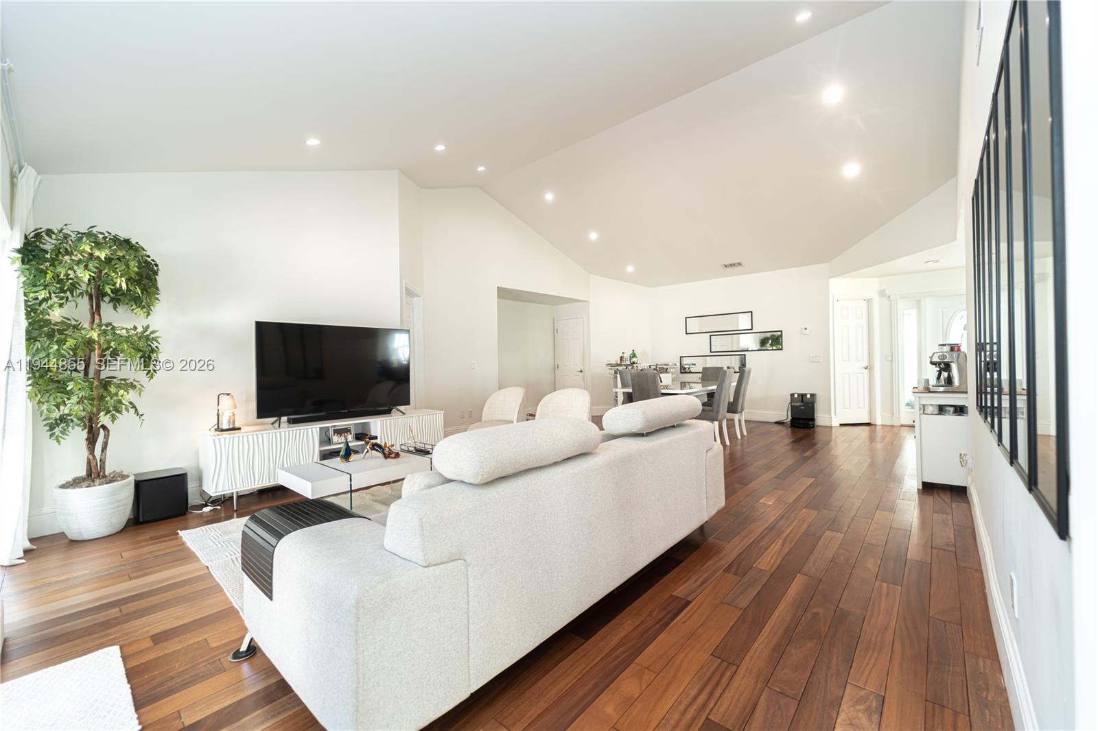 Beautifully remodeled one-story home in the gated community of Doral Woods. This modern and spacious residence features 4 bedrooms, 3 full bathrooms, and a versatile den ideal for an office, playroom, or guest space. The open layout showcases high vaulted ceilings, wood floors, and abundant natural light throughout. The contemporary kitchen offers white cabinetry, quartz countertops, stainless steel appliances, and an oversized island perfect for daily living and entertaining. French doors open to a private patio, enhancing the home’s seamless indoor–outdoor flow. All bathrooms have been tastefully updated, and the property includes impact windows and doors. Doral Woods is a quiet, exclusive community with a private pool, plus HOA access to Doral Country Club amenities such as gym, pool, restaurants, playground, tennis and more.