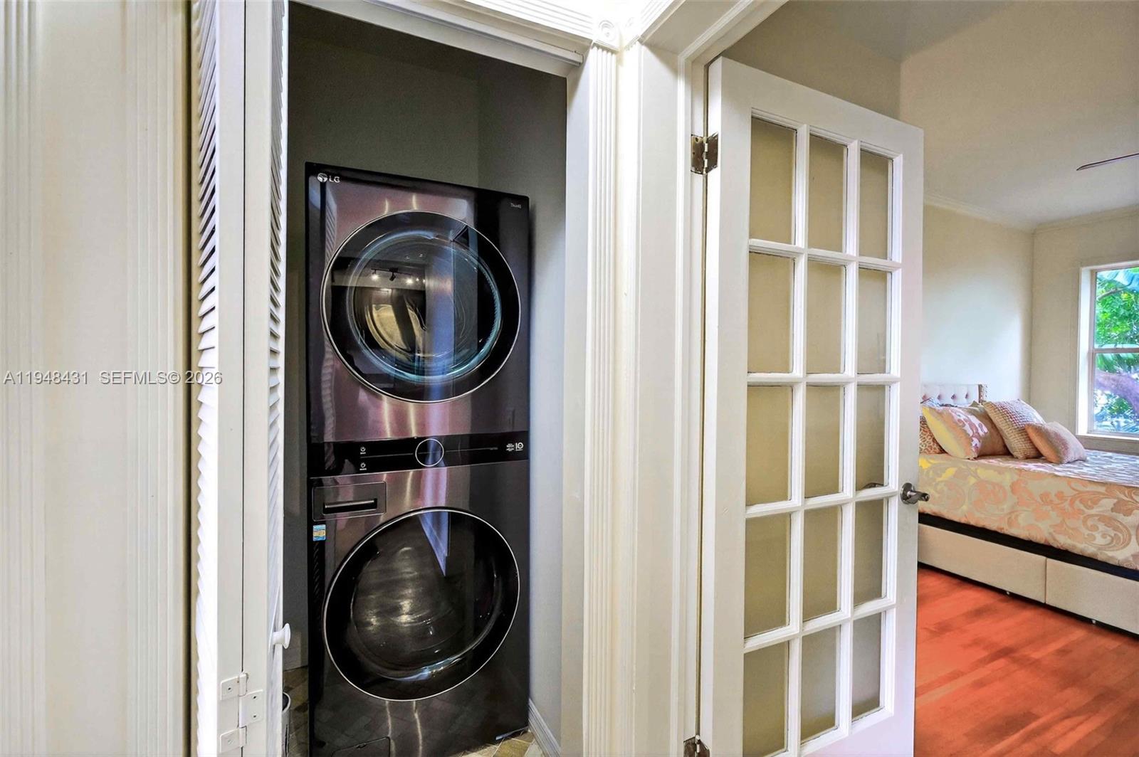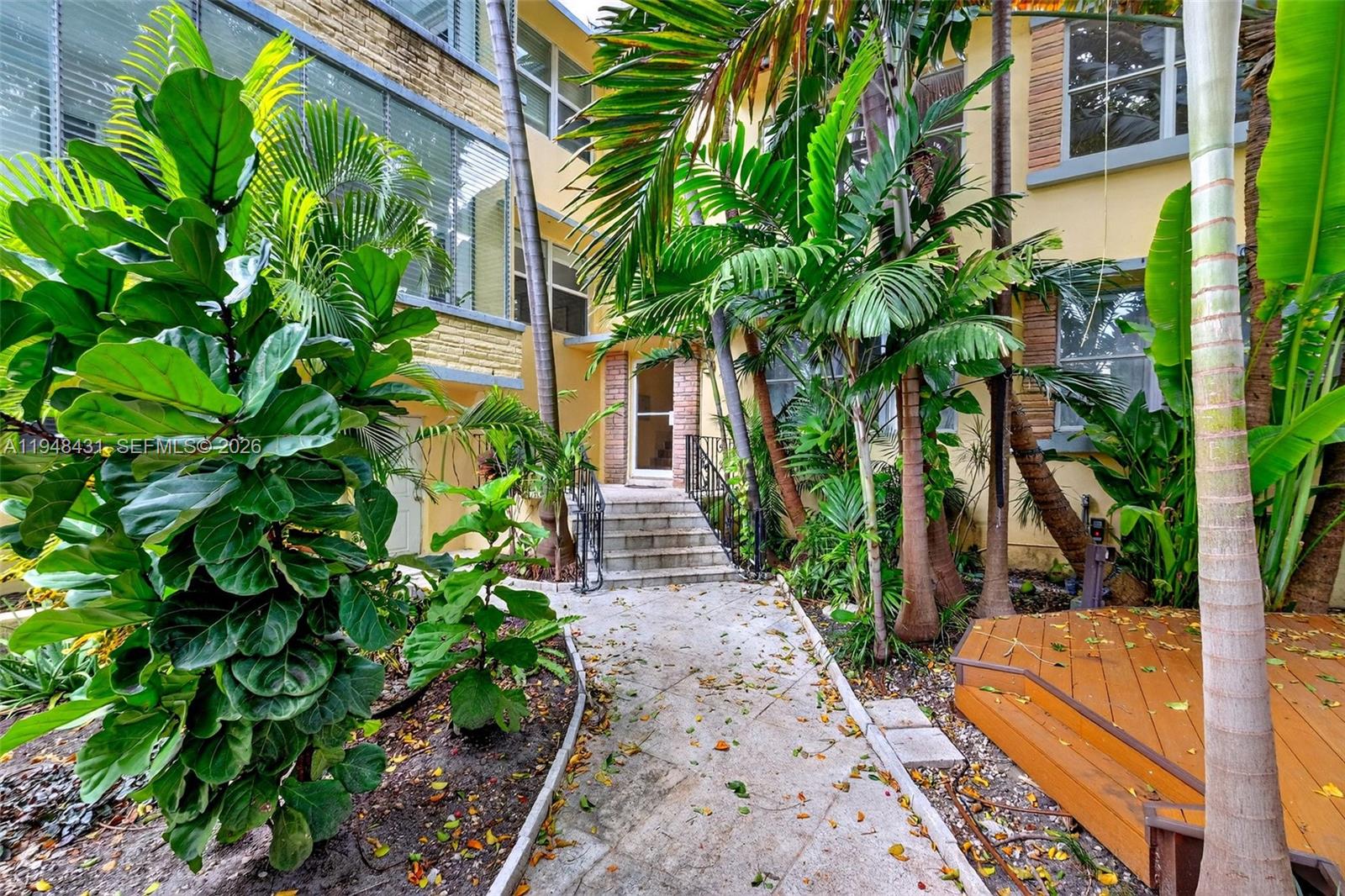 Charming tropical retreat nestled in a lush garden setting within an intimate boutique building of only 8 residences. This top-floor walk-up 2BD/1BA tastefully upgraded with granite kitchen, stainless steel appliances, hardwood floors, faux deco fireplace, the convenience of an in-unit full-size WASHER & DRYER and NEW CENTRAL AC. Furniture may remain or be removed. Easy Zone 3 residential permit parking directly in front of the building (24-hour residential zone). Centrally located with exceptional walkability within 2 blocks of Lincoln Road, Flamingo Park, Espanola Way, all the vibrant local shops, restaurants, and the beach. PET FRIENDLY! Easy to Show! Move-in ready. CHECK OUT THE WALK THROUGH VIDEO