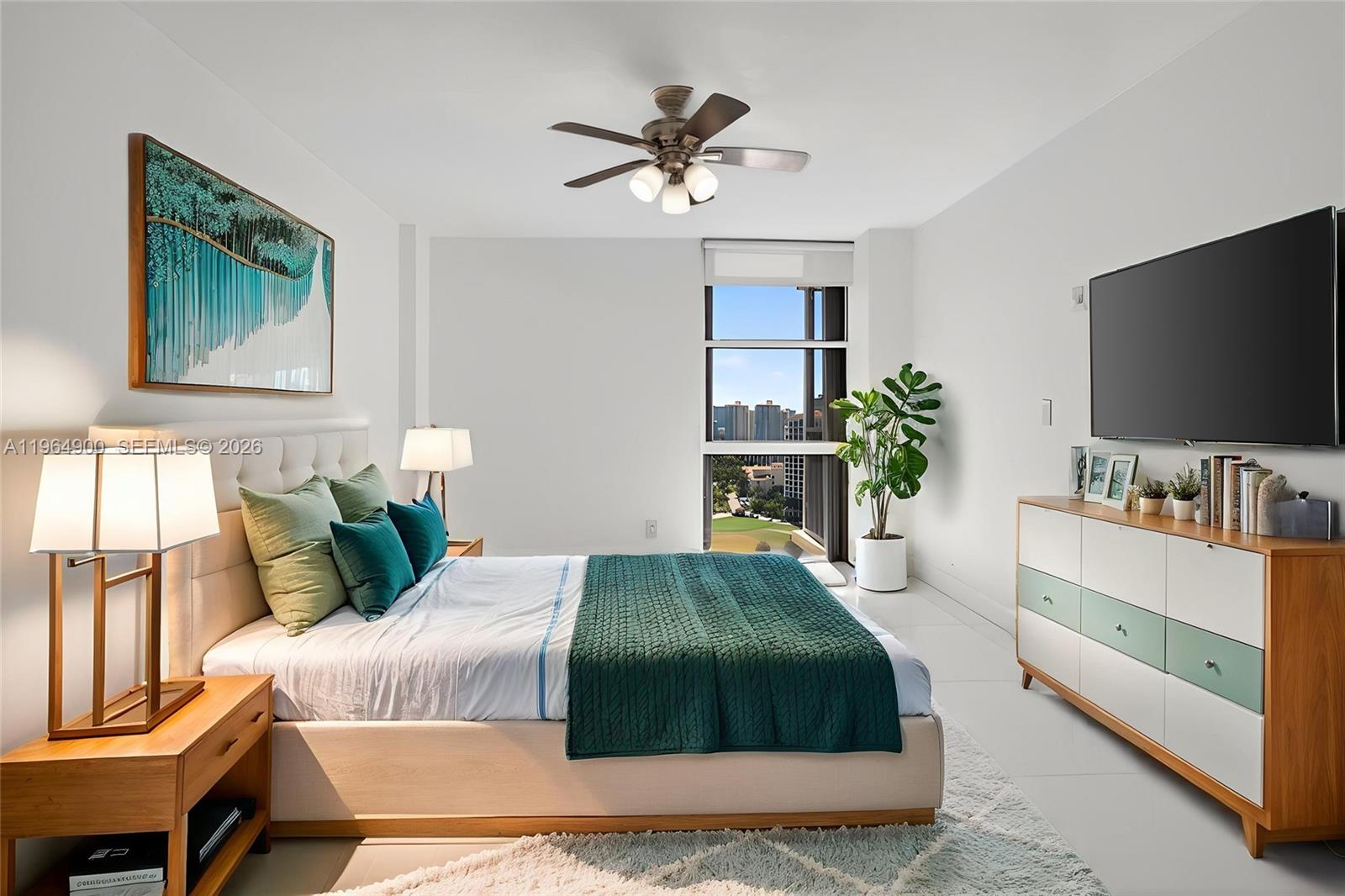 Amazing 2 Bedroom and 2 Bathrooms condo with a panoramic view of the Golf Course, Ocean and Lakes, located along Country Club Drive in the heart of Aventura. This rare to find corner unit is remodeled and features stunning views from every bedroom and living room. Two ensuite bathrooms. Remodeled kitchen with granite counter tops. One cover parking and plenty of guess parking. Brand new impact windows. Porcelain tile floors throughout. Spacious and full of natural light. Plenty of closet space and walk-in closet in the primary bedroom. Rent includes water, internet and cable. Full amenities community with fitness center, sauna, heated pool, jacuzzi, Security 24/7.
