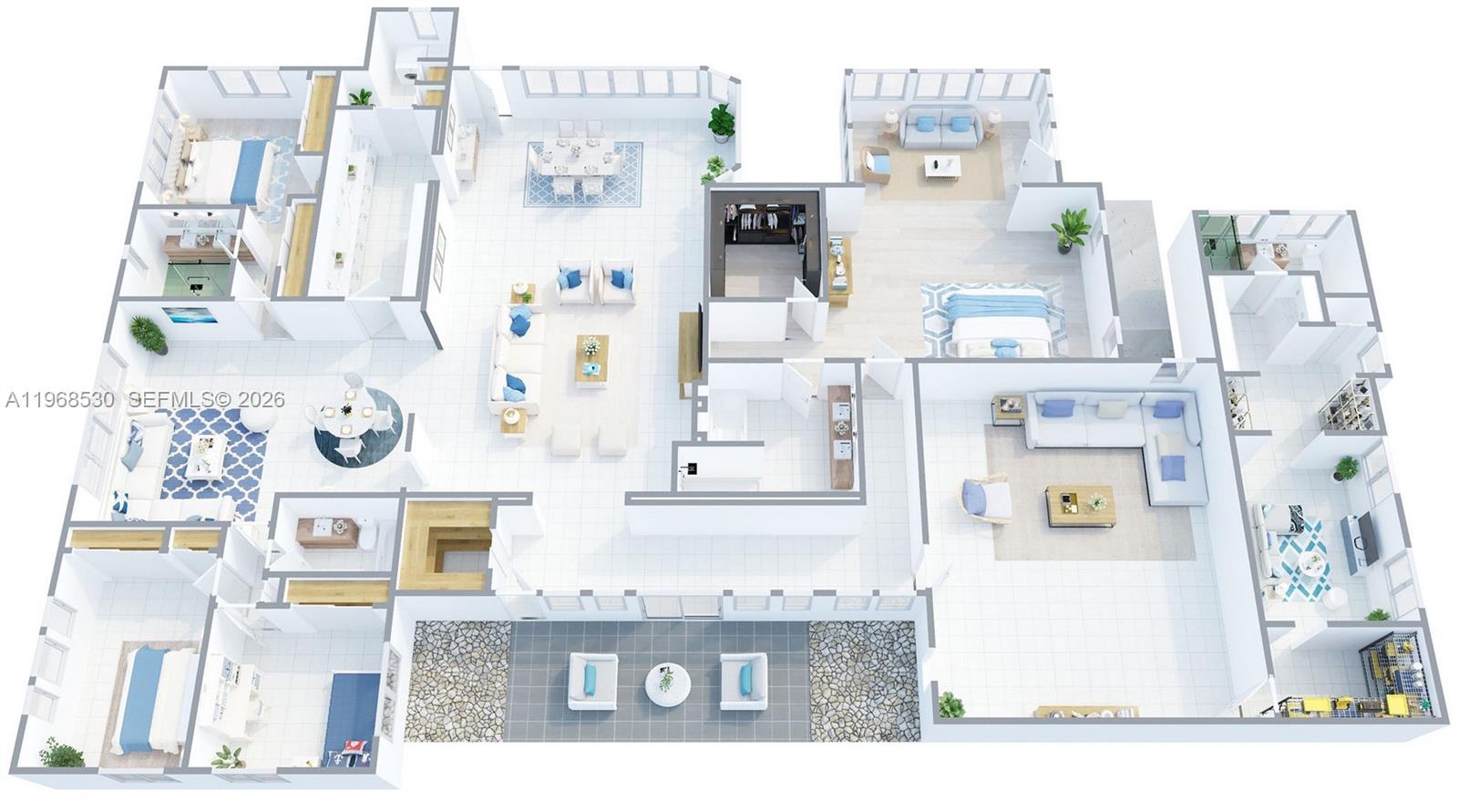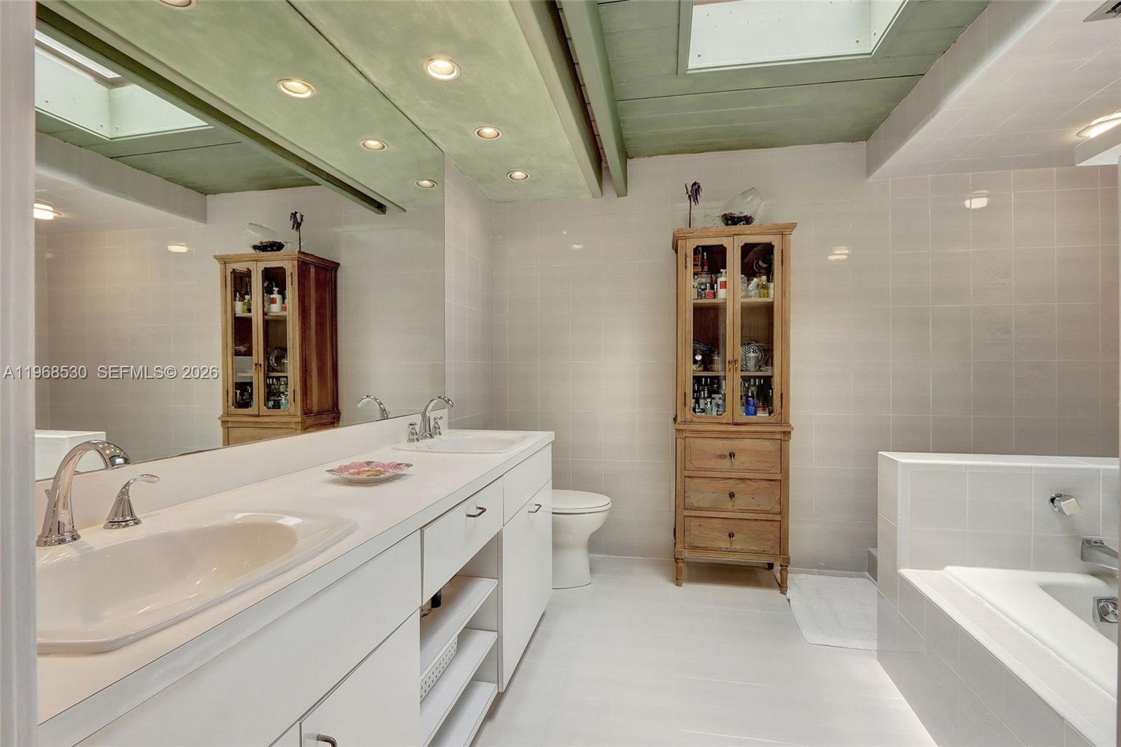 Sprawling 5 bedroom, 4 bath home is nestled on an acre of gracious oaks and lush greenery. Meandering pathways lead to quiet spots for relaxation and nature watching. Unique home has oversized windows showcasing serene views. Wood vaulted ceiling accents main living. Expansive primary suite features spacious sitting area with skylights and plantation shutters overlooking lush gardens. Gather with friends in the large entertainment room with mahogany pub-style bar. Home boasts office space, fireplace, and generously sized rooms. Kitchen features Corian counters, sleek Italian cabinetry, and built in Sub Zero.