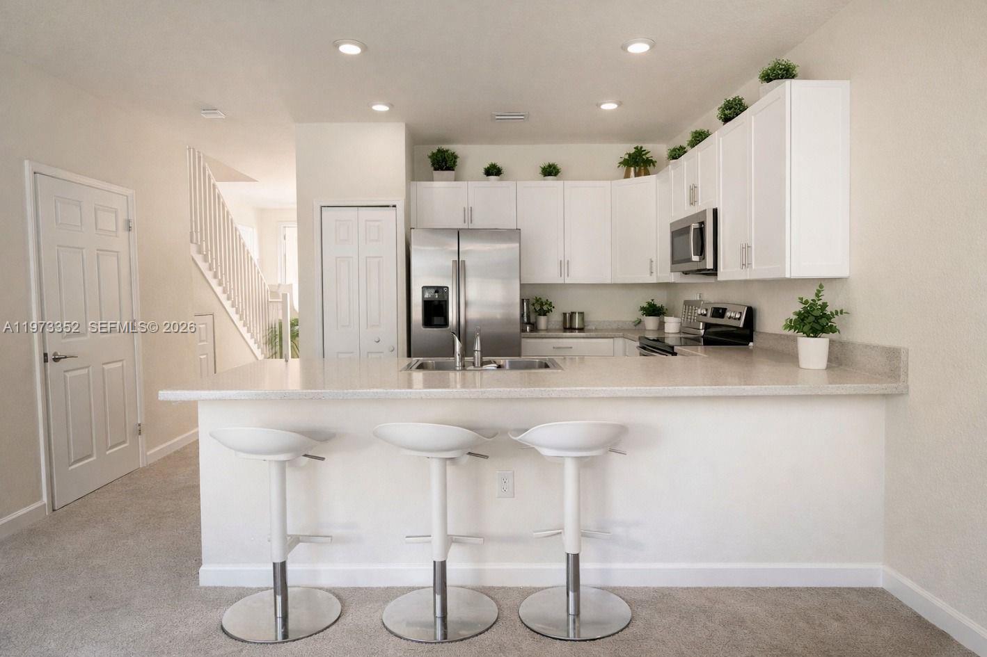 Discover this beautiful 3-bedroom, 3-bath offering a smart and comfortable layout. The home includes a convenient first-floor bedroom with a full bathroom, ceramic tile flooring on the main level, and carpet throughout the second floor. The contemporary kitchen features a large island that enhances both daily living and entertaining. Upstairs, you’ll find two generously sized bedrooms, each with its own private bathroom, providing excellent privacy. The fenced backyard is perfect for outdoor dining, BBQs, and artificial grass. Located in the highly desirable AquaBella community in Hialeah Gardens, this property offers quick access to schools, shopping centers, supermarkets, and major highways such as I-75. Residents enjoy a resort-style clubhouse with a children’s splash area, BBQ zones, a swimming pool, fitness center, and elegant event rooms. "Property available as of April 15"