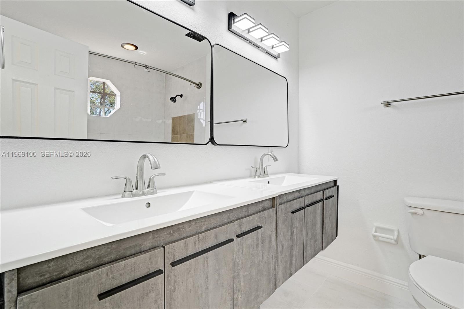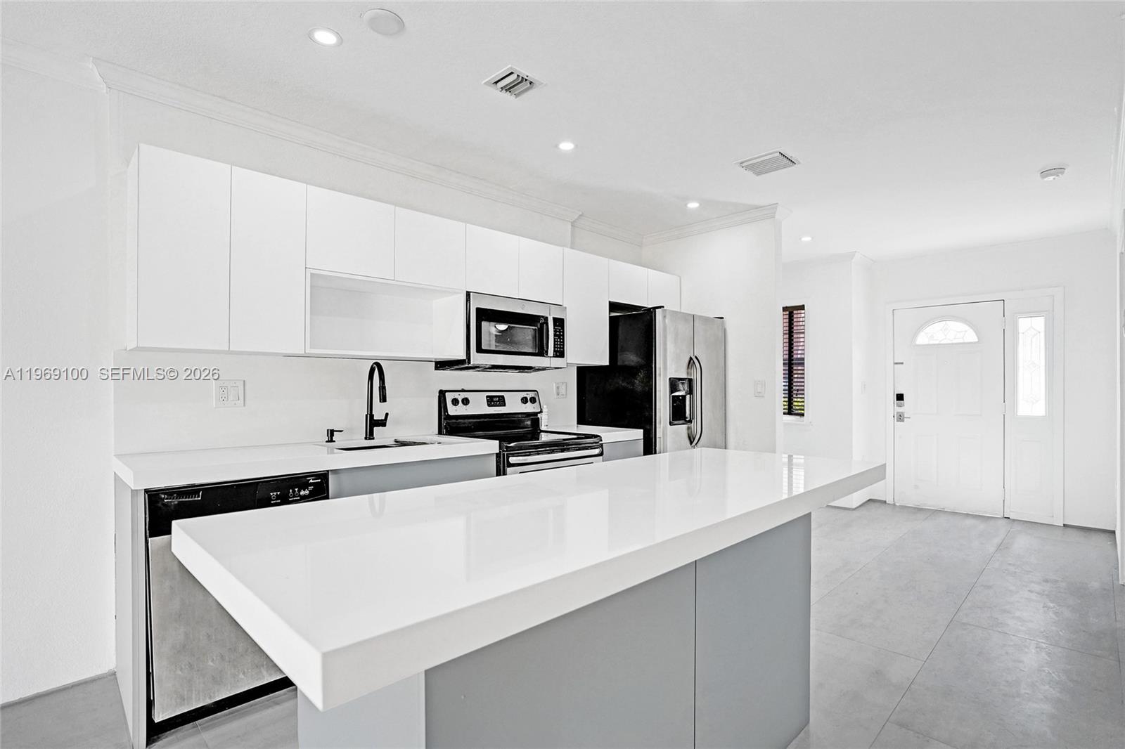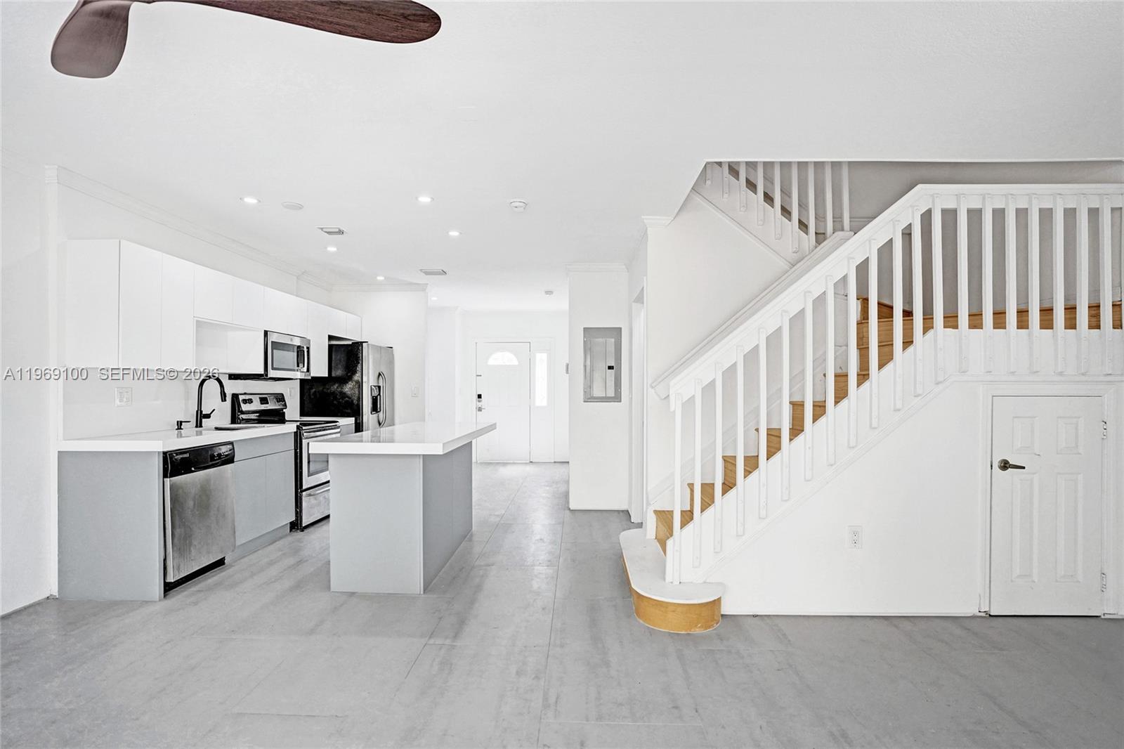 Welcome to this renovated and modern corner villa in Kendall. This home features 3 bedrooms, 3 updated bathrooms, a formal living and dining area. An open concept layout shows a sleek kitchen with quartz counters, island, new cabinets and stainless steel appliances. Spacious family room with new tile flooring throughout. 1 Bedroom is conveniently located on the first floor. Upstairs, the Master Suite includes a walk-in closet and a luxurious roman tub, along with on additional bedroom and a convenient washer/dryer. Additional new upgrades include: plumbing fixtures, closets, lighting fixtures and ceiling fans. Fenced patio offers great space for entertaining. Amenities include a pool, clubhouse, gym, children's playground, and guest parking. Gated community is ideally located near Downtown Dadeland, Baptist Hospital, gourmet eateries, the metro station, and Miami Airport. Don't miss this fantastic opportunity to live in the Villas of Barcelona.