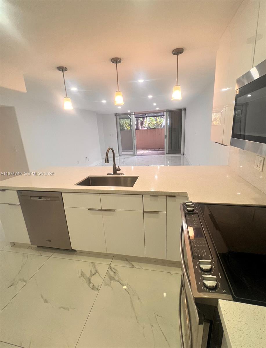 Only first month and one security deposit needed to move-in. Totally updated and beautiful first floor condo across from Miami Dade College Kendall Campus. Open floor plan with kitchen/dining area, quartz countertops, stainless steel appliances, microwave and dishwasher for extra convenience. Tiled wall design in first bathroom with separate 2nd shower head with white cabinet. Master bath is totally revamped with open closet space inside the double sink bathroom with shower. Ceiling fans in every bedroom plus a Titan water heater. Enclosed screened patio with accordion shutters for extra hurricane safety. Enjoy the pool, tennis court, 24/7 Security, on-site laundry facilities, BBQ area, and Clubhouse. Minutes to shopping, grocery stores restaurants and entertainment. Move in ready and a pleasure to see.