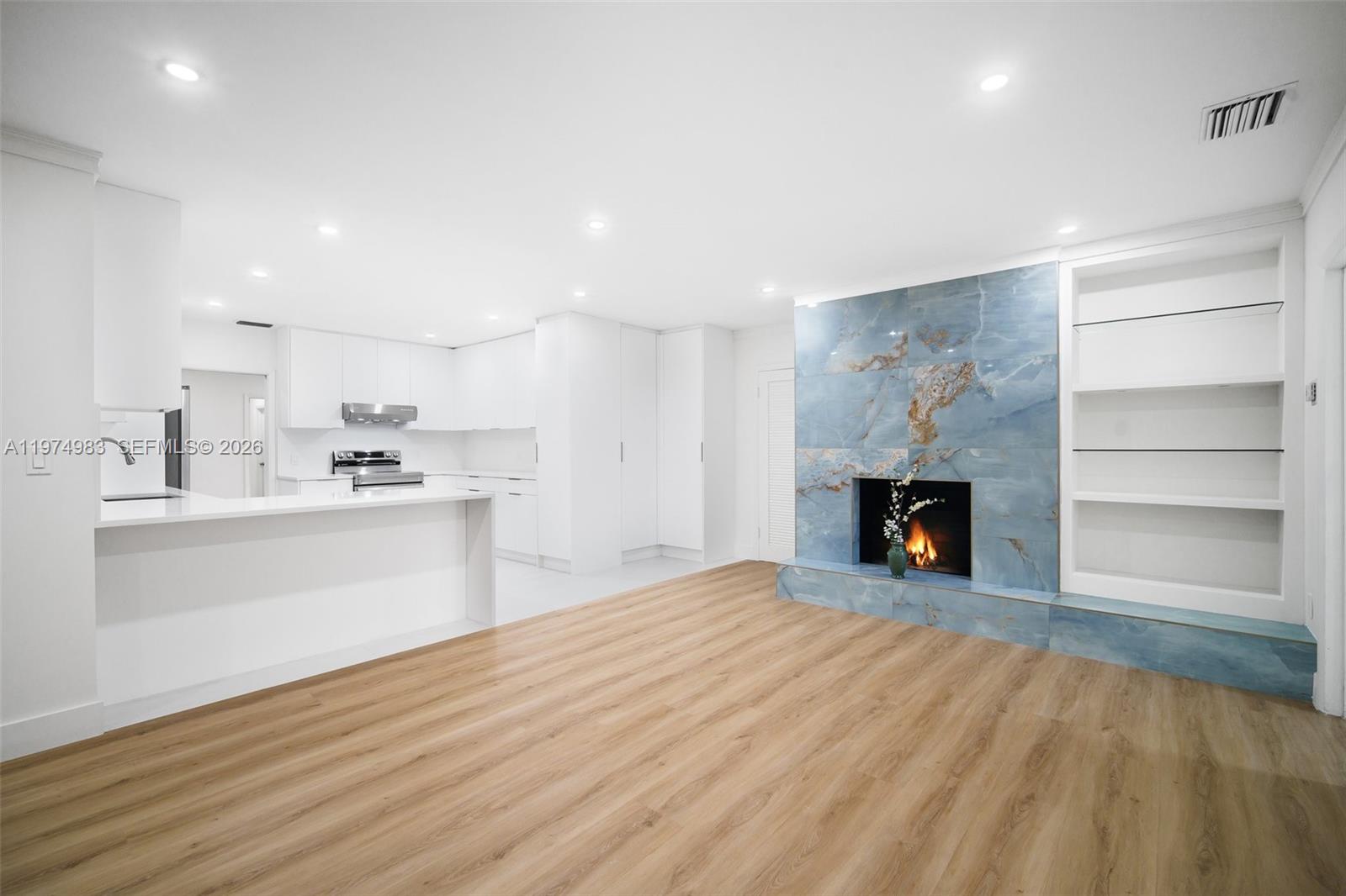 Beautifully updated ranch-style 4-bedroom, 2-bath residence offering an ideal blend of comfort, style, and convenience in the heart of Palmetto Bay. This home features a spacious, light-filled layout enhanced by modern finishes throughout. The open-concept kitchen showcases sleek European-inspired design, clean lines, and minimalist elegance—perfect for both everyday living and entertaining. The inviting living area is anchored by a cozy wood-burning fireplace, creating a warm and welcoming atmosphere, while the family room’s bay window fills the space with abundant natural light. Outdoors, enjoy a private and tranquil setting with a pool—an ideal retreat for relaxing evenings or quiet gatherings under the stars.