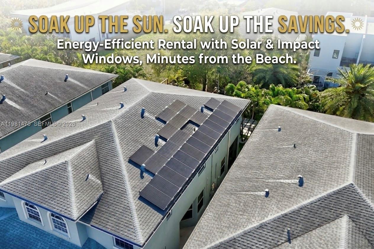 ENERGY-EFFICIENT HOME WITH VERY LOW ELECTRIC BILLS JUST MINUTES FROM THE BEACH. This beautifully upgraded rental offers a rare combination of comfort, space, storage and efficiency not typically found in rental properties. Over 2300 sq ft, 3 beds / 2 and 1 half bath home complete with one car garage and spacious backyard. Featuring solar panels and impact windows, the home is designed to keep electric costs low while providing year-round comfort and storm protection. Inside, you’ll find large, light-filled rooms and exceptional storage throughout. The stylish kitchen features granite countertops, stainless steel appliances, and rich mahogany-finished cabinetry, creating a warm and functional space for everyday living and entertaining. Upstairs are three spacious bedrooms, each with large closets. The primary suite includes a large walk-in closet with custom built-ins and a beautiful bathroom with dual vanities and a huge walk-in shower. Additional highlights include recessed lighting throughout, a screened-in patio, outdoor storage and newly turfed backyard. Located in an unbeatable South Florida location just minutes from the beach, shopping, dining, and major conveniences, this home offers space, upgrades, and energy savings rarely found in rental homes.