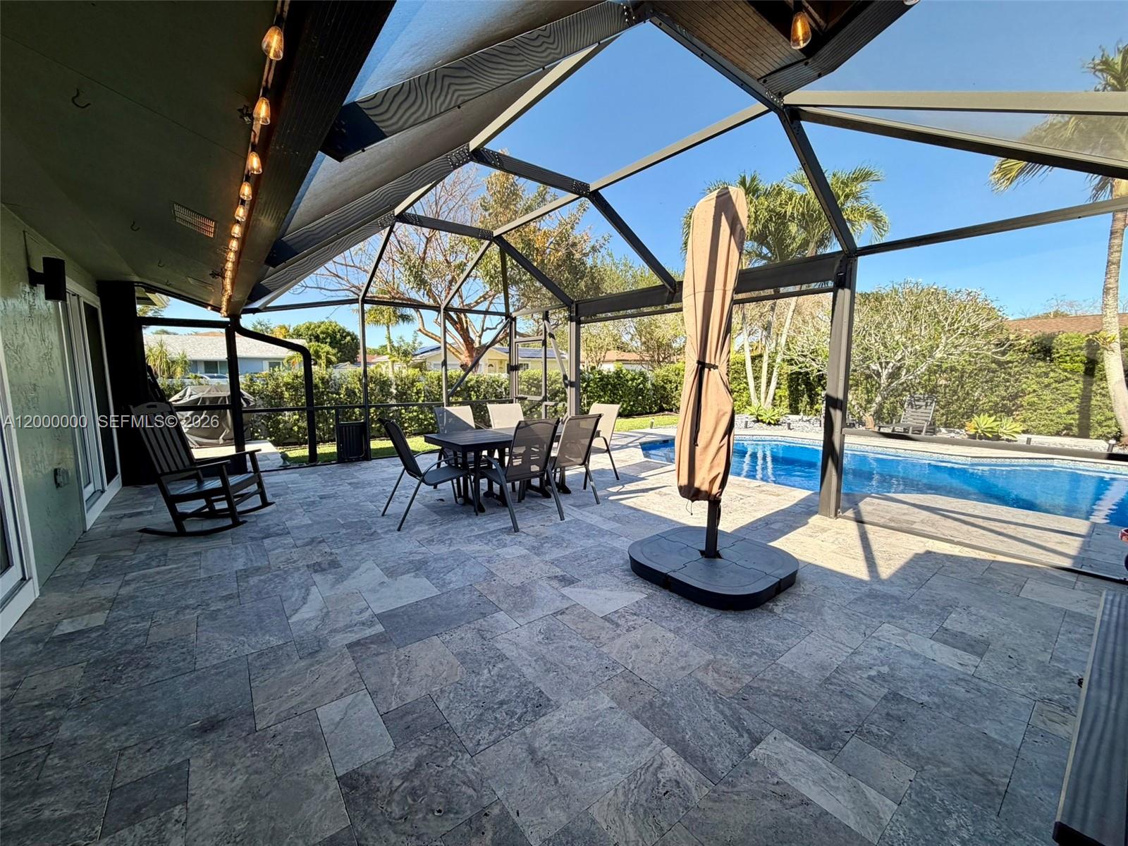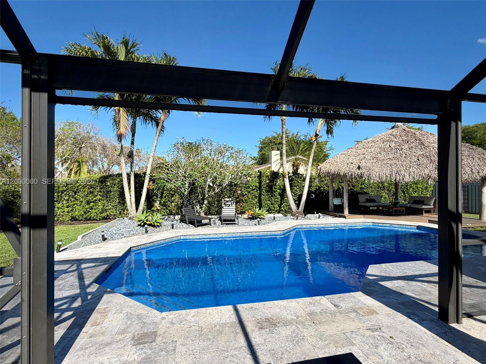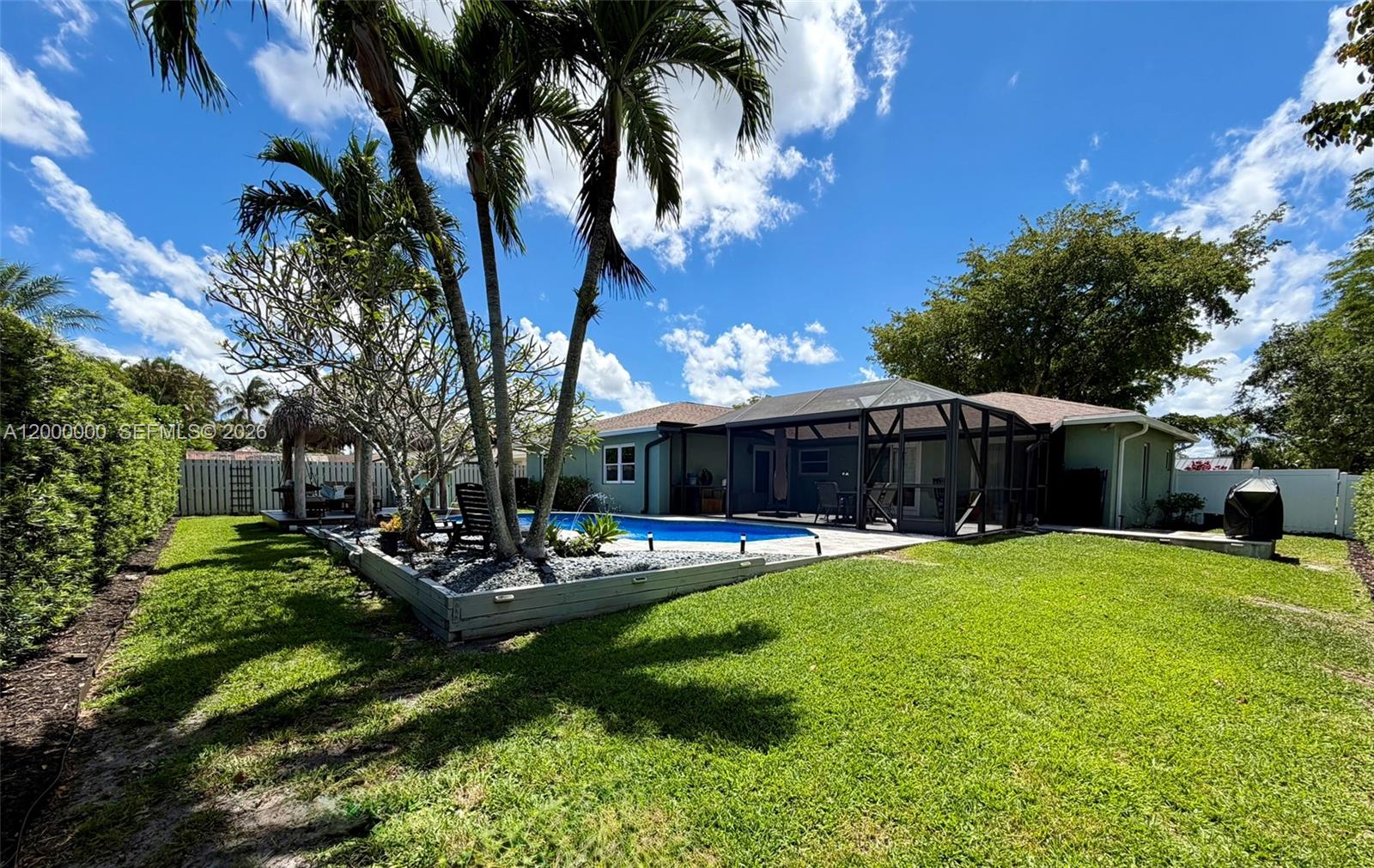 Welcome to this stunning, renovated single-family home located in the highly desired area of Cooper City. Meticulously maintained, this 3-bedr, 2-bath residence boasts a beautifully designed saltwater POOL w/ newly laid non-slip travertine pool/patio deck, w/ a top-of-the-line energy-efficient heater, & BBQ area. The incredible outdoor oasis is complete with a spacious grass backyard, lush privacy landscaping, fountains, & an authentic SEMINOLE TIKI. The property also features pineapple fruit & a screened-in patio w/ a remote-controlled motorized screen that opens fully for entertaining. The immaculate interior has been upgraded w/ rectified PORCELAIN floors, GRANITE countertops, & Danish designer architectural lighting in the dining room & kitchen. Additional features are: all hurricane IMPACT-rated windows, doors, & 2 car garage door, AMPLE built-in cabinetry in the living & dining rooms, blackout blinds in all bedrooms, NEW high-end carpeting in the second & third bedrooms, NEW washing machine & dryer, situated on a corner lot w/ NO side neighbors. This beautiful home offers the very best of indoor & outdoor living, perfect for families celebrating the best Florida lifestyle! Cooper City is an ideal location to raise a family, offering "A" rated schools, top-rated private schools close by, large lake view park w/in walking distance, tennis courts, dog parks, & multiple shopping centers. PLUS landscaping & weekly Pool maintenance included. FURNISHED OPTION AVAILABLE.NO HOA