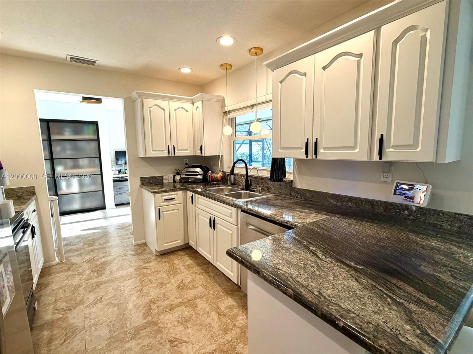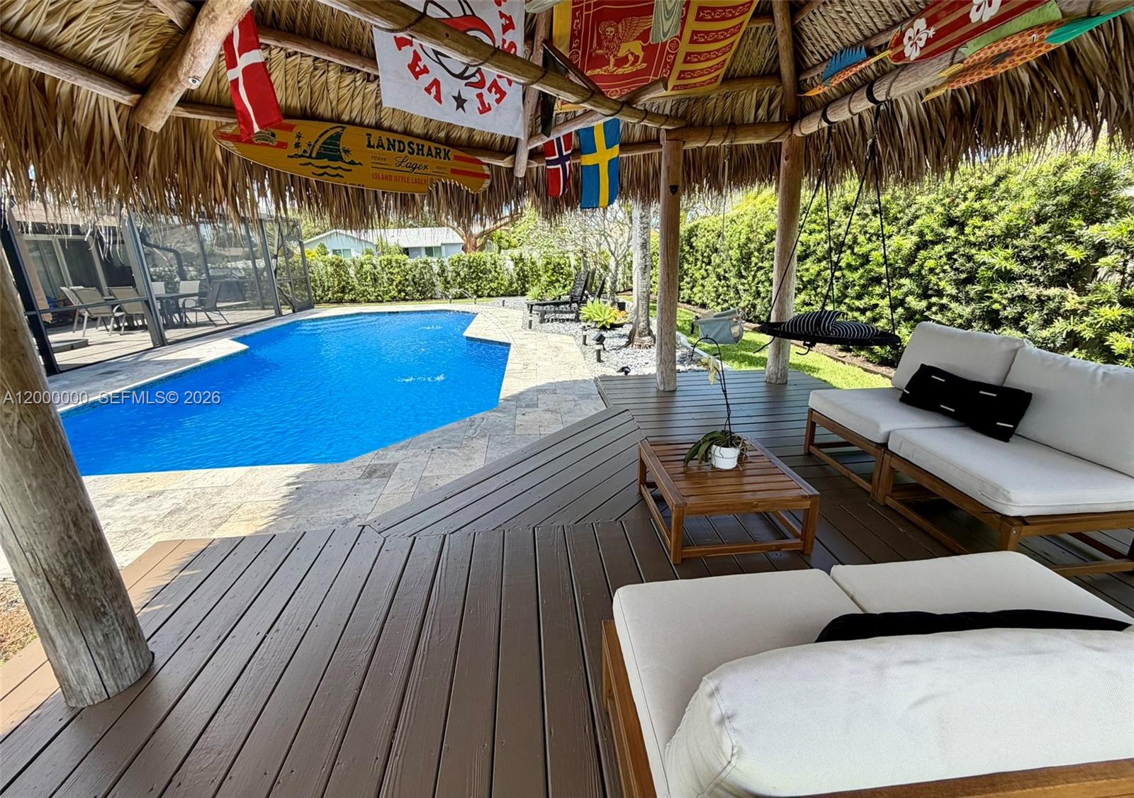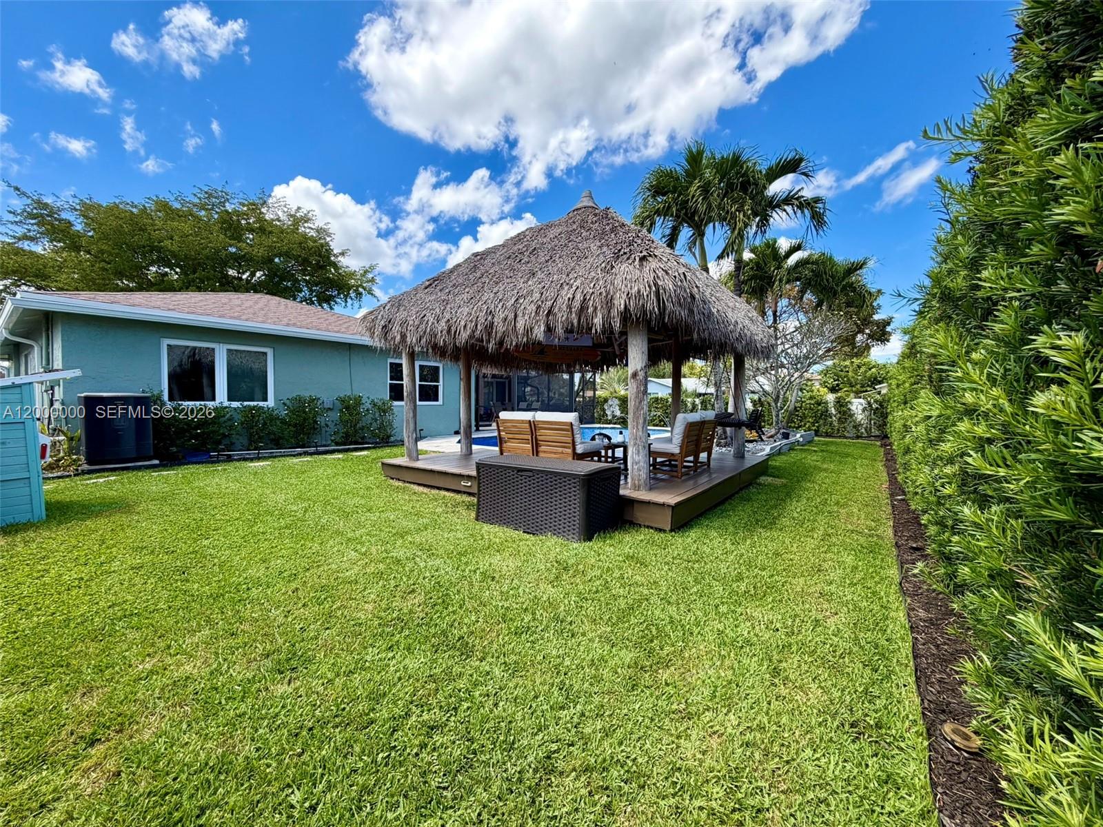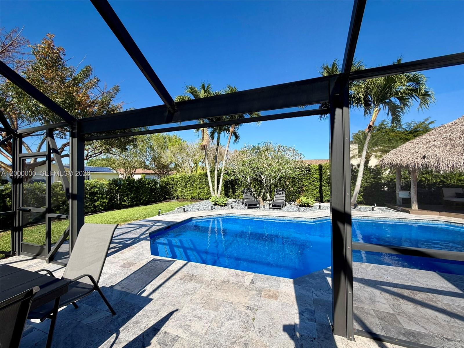 Welcome to this stunning, renovated single-family home located in the highly desired area of Cooper City. Meticulously maintained, this 3-bedr, 2-bath residence boasts a beautifully designed saltwater POOL w/ newly laid non-slip travertine pool/patio deck, w/ a top-of-the-line energy-efficient heater, & BBQ area. The incredible outdoor oasis is complete with a spacious grass backyard, lush privacy landscaping, fountains, & an authentic SEMINOLE TIKI. The property also features pineapple fruit & a screened-in patio w/ a remote-controlled motorized screen that opens fully for entertaining. The immaculate interior has been upgraded w/ rectified PORCELAIN floors, GRANITE countertops, & Danish designer architectural lighting in the dining room & kitchen. Additional features are: all hurricane IMPACT-rated windows, doors, & 2 car garage door, AMPLE built-in cabinetry in the living & dining rooms, blackout blinds in all bedrooms, NEW high-end carpeting in the second & third bedrooms, NEW washing machine & dryer, situated on a corner lot w/ NO side neighbors. This beautiful home offers the very best of indoor & outdoor living, perfect for families celebrating the best Florida lifestyle! Cooper City is an ideal location to raise a family, offering "A" rated schools, top-rated private schools close by, large lake view park w/in walking distance, tennis courts, dog parks, & multiple shopping centers. PLUS landscaping & weekly Pool maintenance included. FURNISHED OPTION AVAILABLE.NO HOA